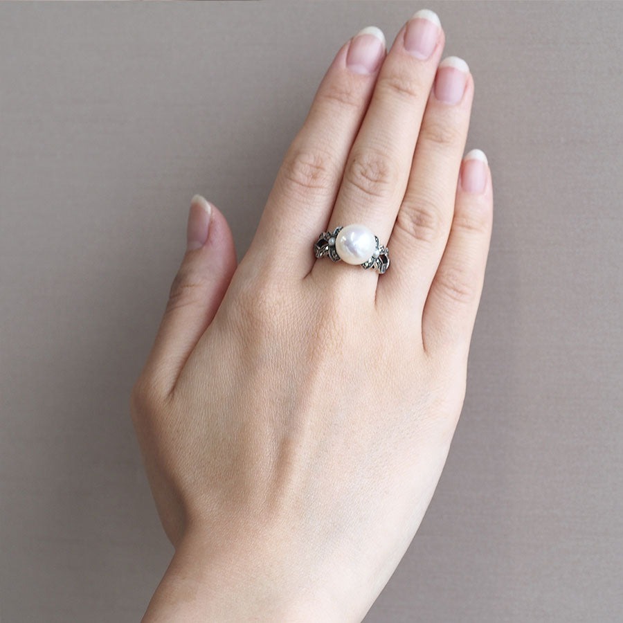 呢個戒指由飽滿突顯存在感嘅珍珠,配以小珍珠同鋯石裝飾嘅蝴蝶結串成。蝴蝶結部分係立體設計,帶出柔軟蓬鬆嘅感覺,好似真係打好嘅蝴蝶結咁。蝴蝶結中間細細粒嘅小珍珠,設計可愛得嚟又精緻。珍珠夠大,即使只係一粒都好有份量,但設計簡約,方便日常佩戴,輕鬆享受。