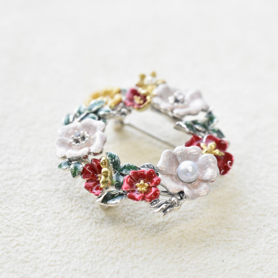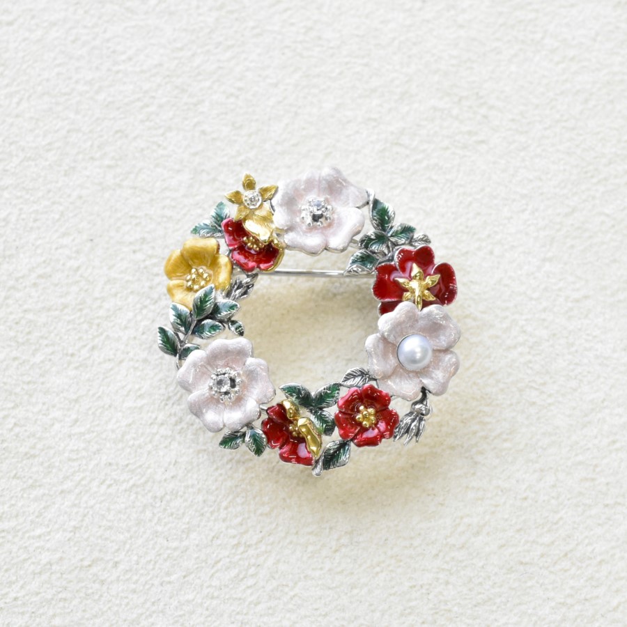使用銀質作底,再施以琺瑯,並用天然石裝飾。精美嘅工藝同琺瑯色彩帶嚟華麗效果。花環設計冇斷口,而玫瑰嘅花語係愛,因此象徵永恆,希望訪來嘅幸福同愛情可以永遠持續。華麗嘅玫瑰花設計豐滿柔軟,非常細膩。