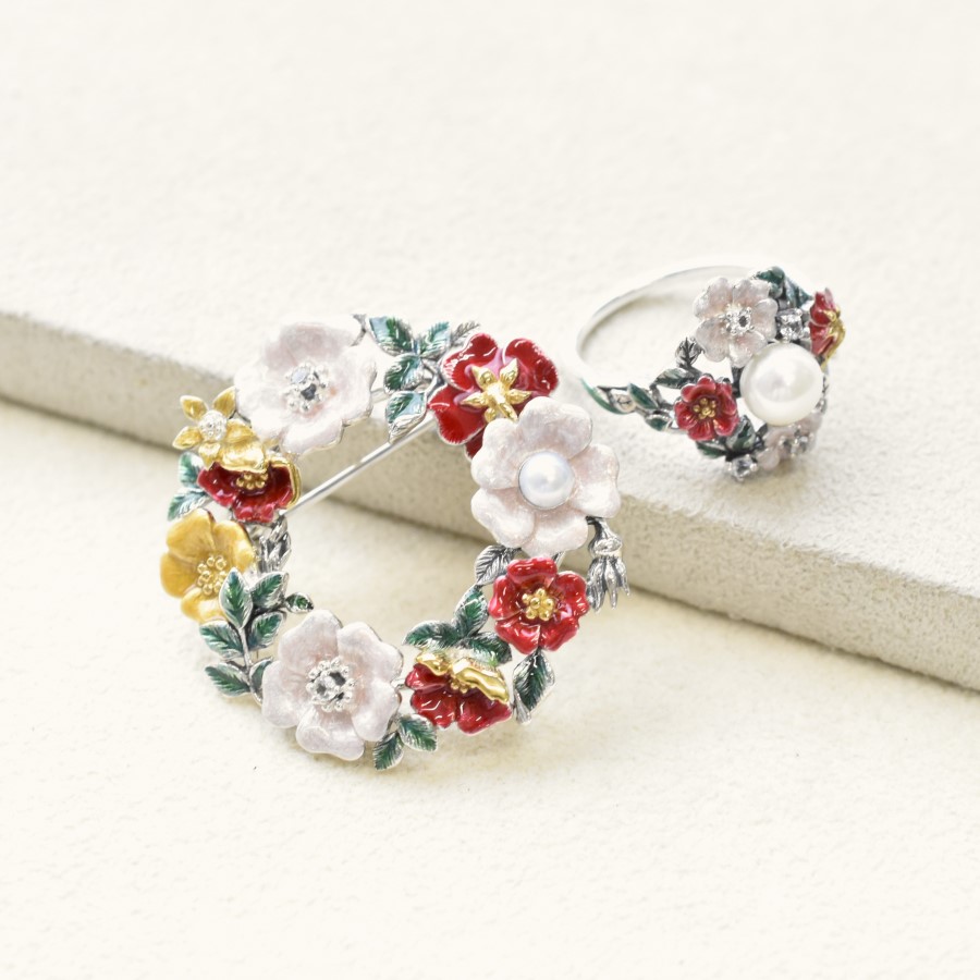 喺需要精確描繪嘅植物畫入面,畫家盧杜特(Ruduté)以表現情感豐富嘅細膩美而被稱為「花之拉斐爾」,呢款「玫瑰花環」植物藝術啟發咗呢款多彩又可愛嘅胸針吊墜。