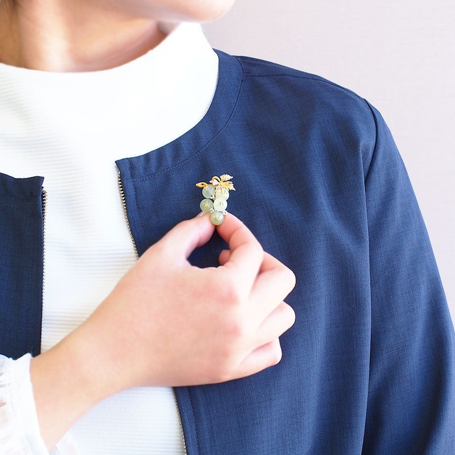 呢款彩色又可愛嘅吊咀胸針,靈感來自被稱為「花中拉斐爾」嘅畫家盧杜特(Pierre-Joseph Redouté)嘅植物畫《葡萄樹》,佢喺需要高度精確嘅植物畫中,表現出情感豐富嘅細緻美。盧杜特係18世紀後期到19世紀中期活躍於法國嘅宮廷畫家,以「玫瑰畫家」、「花卉畫家」聞名,佢獲得瑪麗安托萬內特同拿破崙皇后約瑟芬嘅賞識,創作咗大量優美嘅花卉作品。佢嘅花卉作品運用高超嘅銅版畫技術同細膩手彩色,表現出精緻同典雅,作為博物圖譜亦備受高度評價。蛇紋石自古以來就被認為可以保護人免受看不見嘅危險,特別喺夜路行或者旅途中使用。葡萄嘅葉同枝部分使用入咗金粉嘅黃色琺瑯,放喺蛇紋石上嘅飾件則鍍咗金,我哋試圖用同色調但不同光澤嘅方式,展現出閃耀效果。結果係葡萄繁茂結實,帶嚟好運嘅感覺,整件作品令人感覺幸福。帶光澤嘅蛇紋石立體鑲嵌,整體俾人清新鮮明嘅印象。