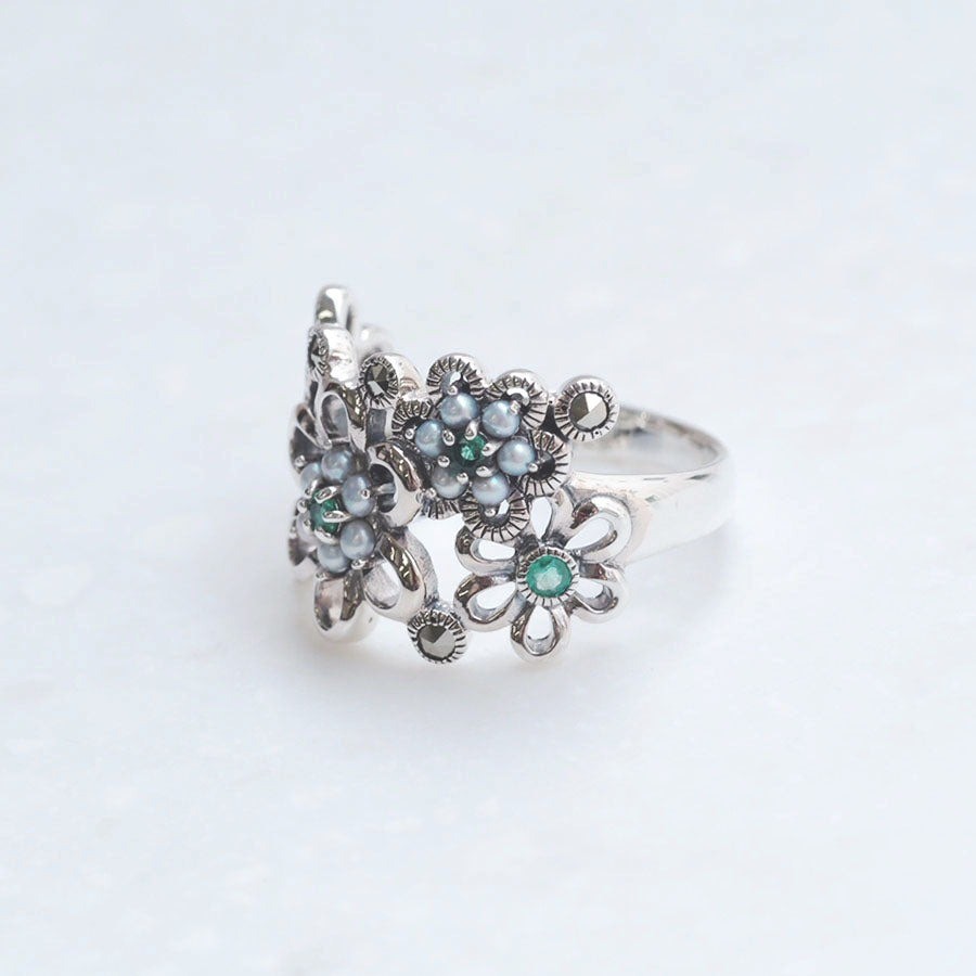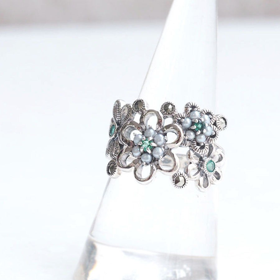 「花開富貴,姻緣綿長」 您手上呢枚 925銀 + 祖母綠 + 馬賽克石 + 珍珠 花朵戒指,五行金生木+水,主打 姻緣、財運、健康、貴人、女性魅力 🌷 復古花園設計:祖母綠花蕊、珍珠花瓣,層層綻放,象徵愛情與財富雙開! 無需開光,心誠則靈!即刻睇您嘅生肖可唔可以戴~