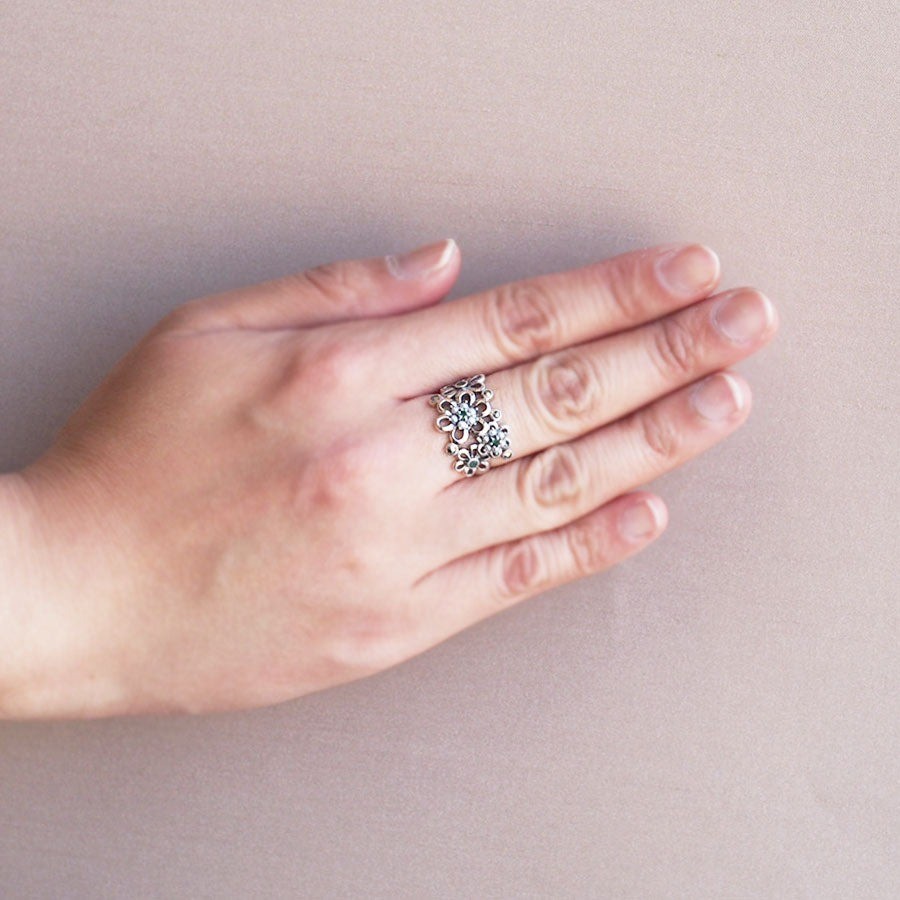 戒指整體較寬,但採用了透空雕花的設計,因此佩戴時不會感到壓迫感,同時能瞬間展現華麗感的戒指。