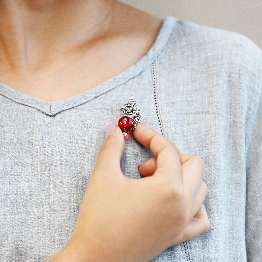 呢款係用鮮艷紅琥珀製作嘅木槿花造型胸針吊墜。紅琥珀以其獨特嘅深紅色同自然美而聞名,佩戴者會散發出華麗嘅氣息。以紅琥珀為主體,周圍裝飾咗細膩嘅木槿花設計。木槿花語有「纖細之美」、「新戀情」同「勇敢」嘅意思。雖然木槿花唔少人聯想係熱帶風情,但碌山嘅木槿花設計四季都可佩戴。紅琥珀自古以來就被視為護身符同療癒寶石。其神秘嘅色彩能夠吸引人心,被認為能帶來幸運。此外,琥珀質地輕巧同觸感溫暖,即使長時間佩戴亦會保持舒適。同系列仲有戒指同耳環/耳夾可供選擇。