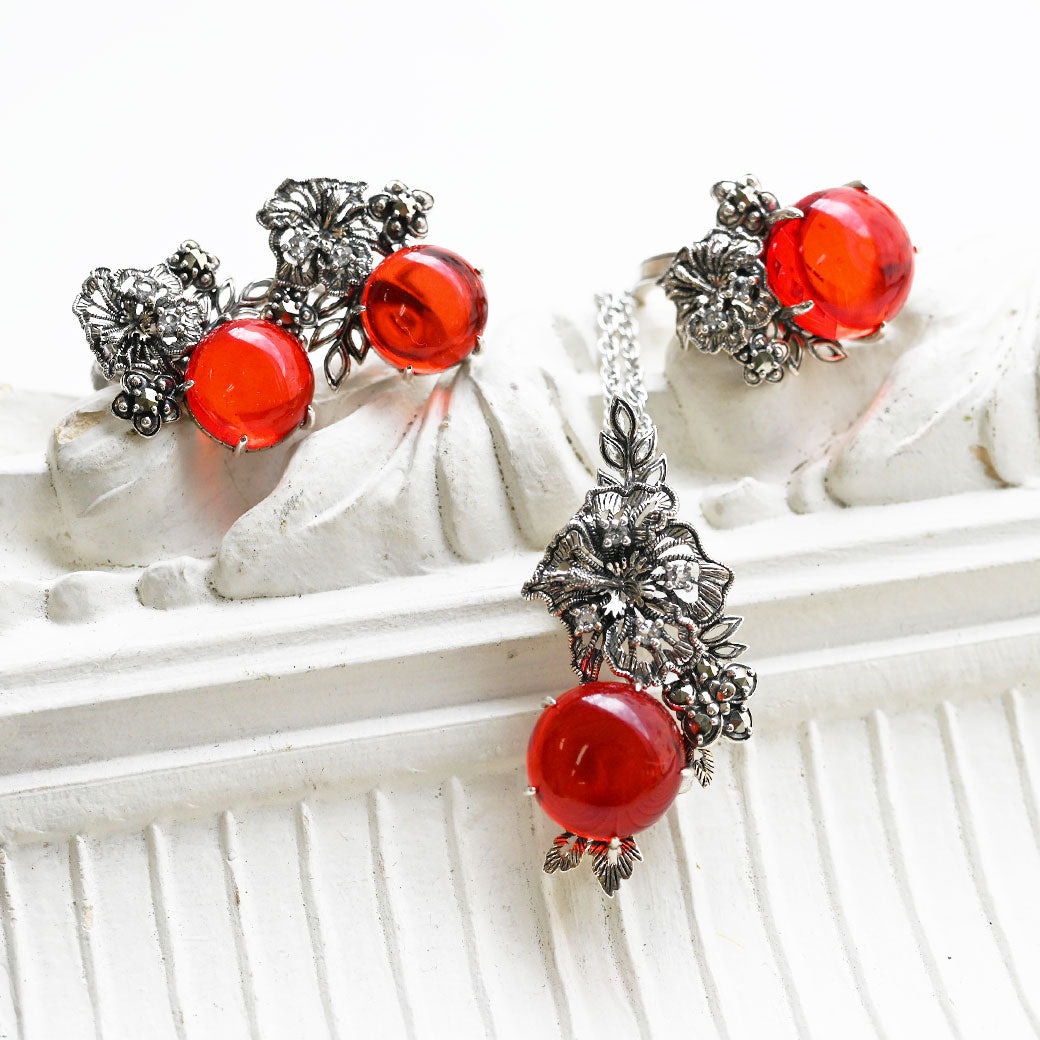 🔥 2025-2026 銀飾運勢指南|紅琥珀花卉套裝(銀+白托帕石+紅琥珀+馬克賽石)