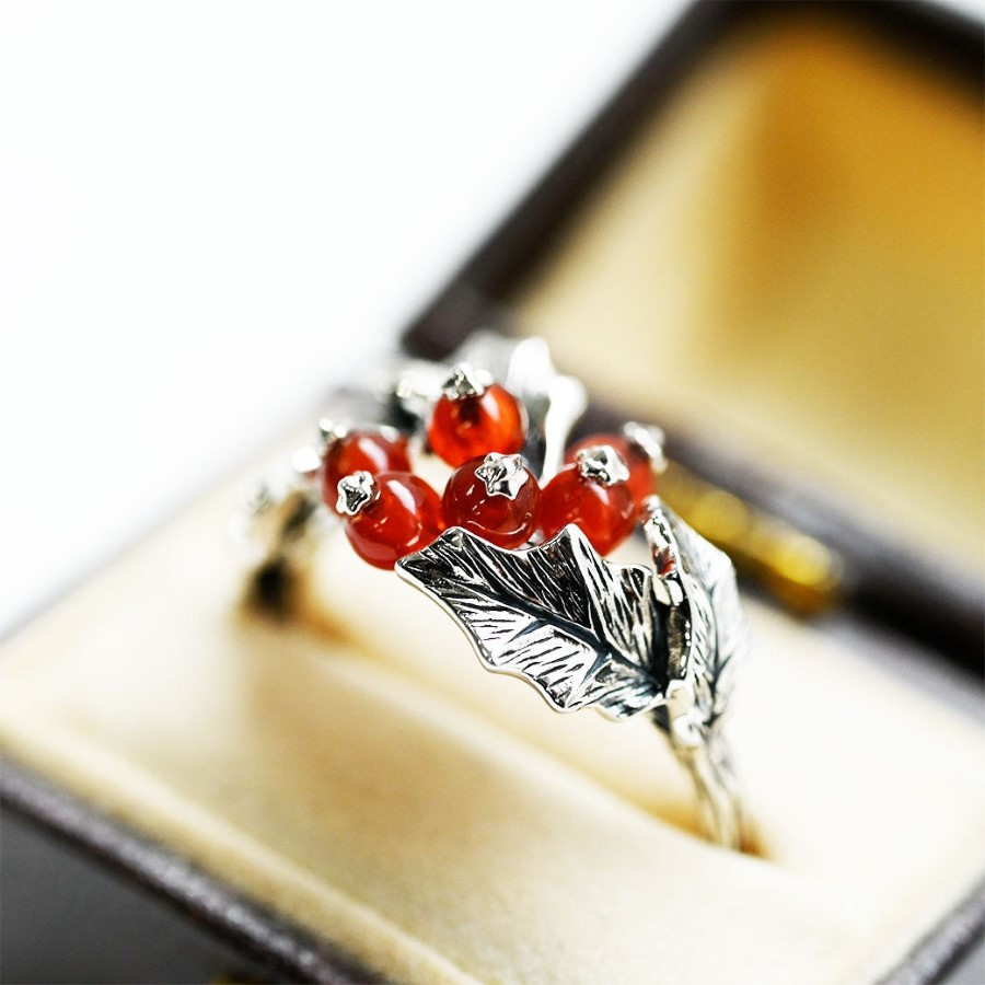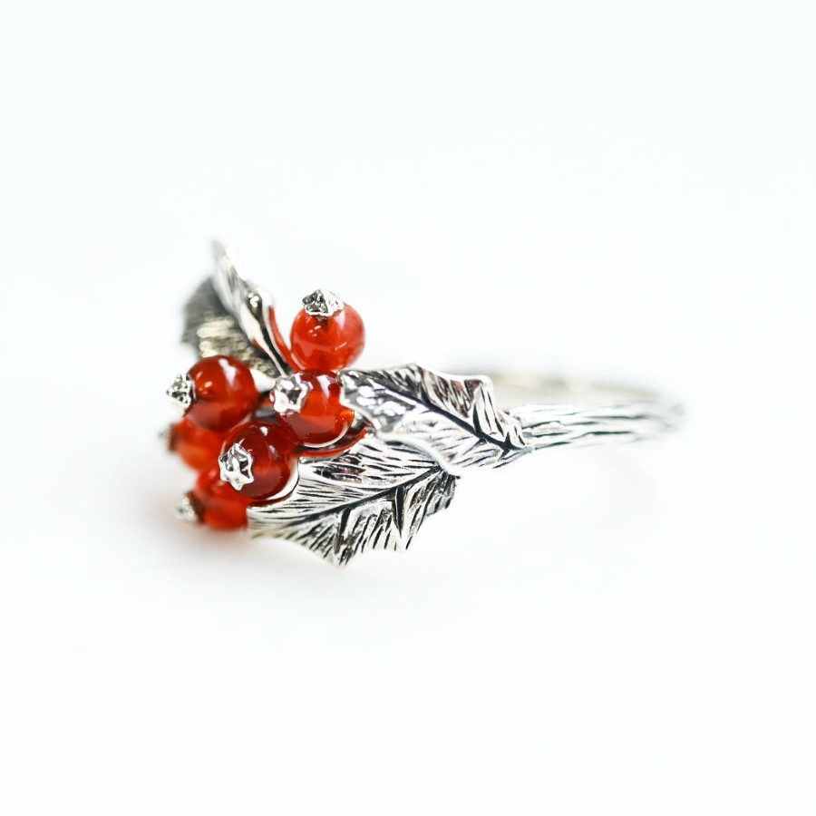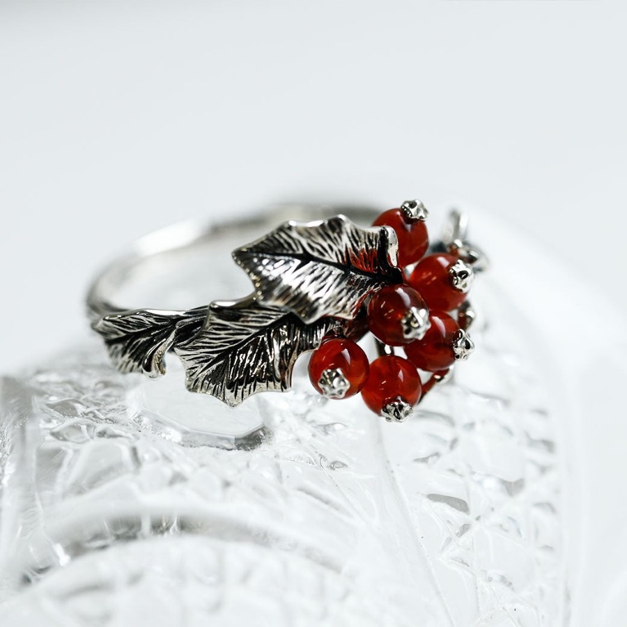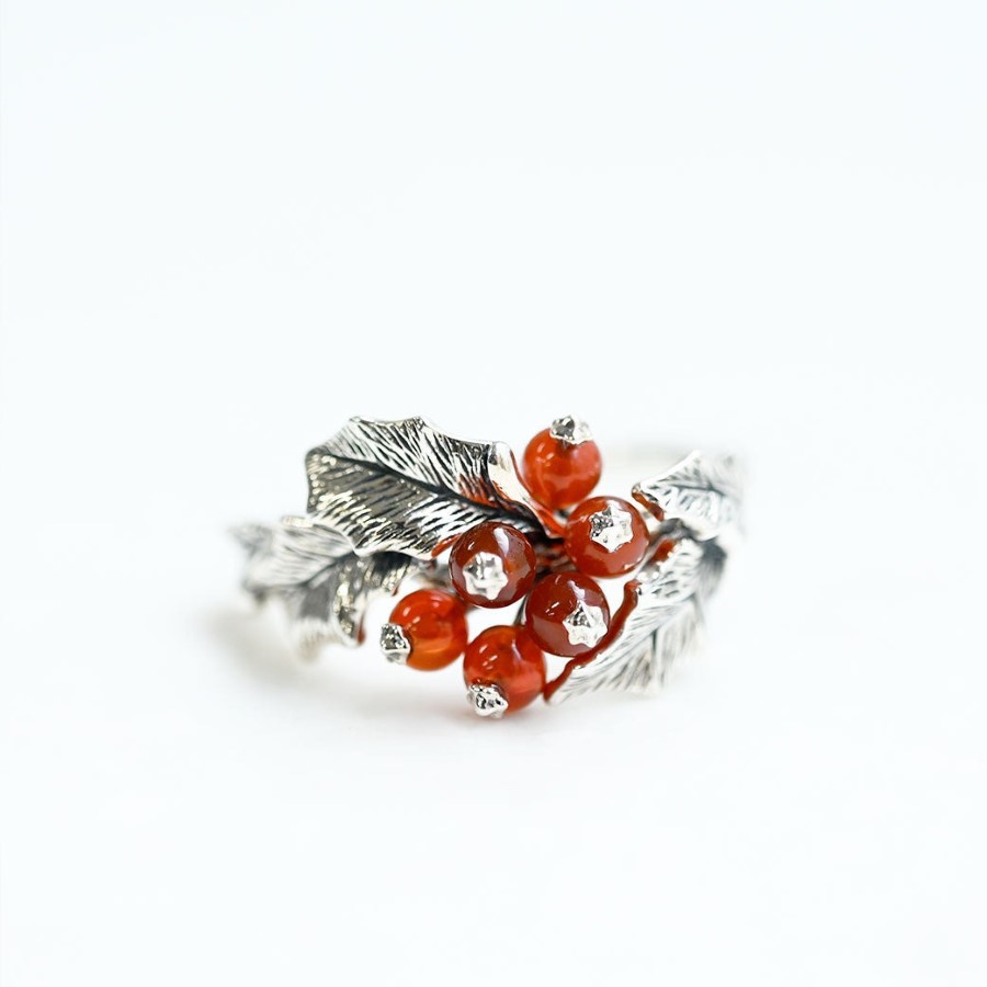 我們將自然優雅的冬青製成了戒指。冬青在歐洲被視為幸運的象徵,原因是它即使在冬天也能保持綠色,代表著力量與繁榮。冬青的果實用紅瑪瑙來呈現,增添了可愛感。纖細設計精緻的葉子紋理與自然的葉片氛圍是其魅力所在。由工匠手工精心製作的設計完美保留了自然的美麗。鮮豔的紅瑪瑙色彩,為戒指增添了一份華麗。日常搭配的亮點是非常適合休閒服裝的單品。只要搭配簡單的毛衣或襯衫,就能打造出洗練的造型。設計不會讓人厭倦,非常適合日常搭配,為每日的穿搭增添亮點。搭配西裝或夾克,不僅能展現個性,亦能營造優雅印象。此外,在派對或晚宴等華麗場合,這枚美麗的冬青戒指和紅瑪瑙定能成為焦點。