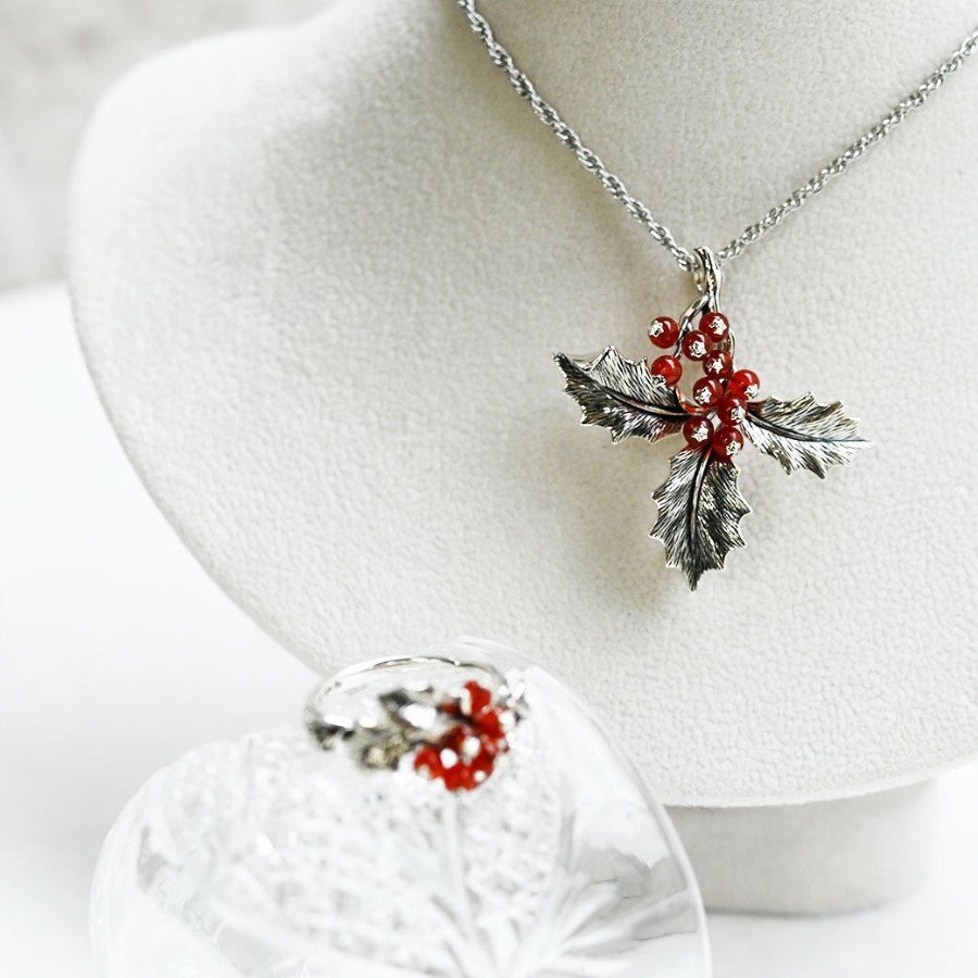 (925銀 + 紅瑪瑙 | Art Deco 冬青葉 + 紅果雙件)