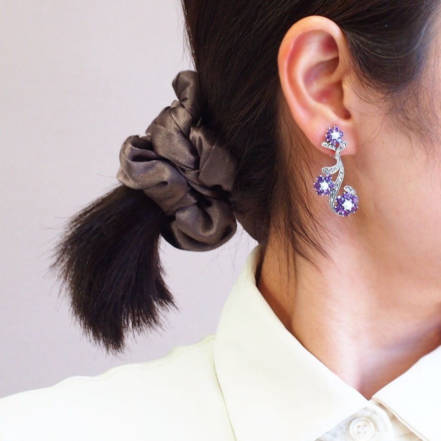 這是一對耳環,上面有三朵不同大小(大、中、小)的可愛紫水晶花朵綻放。花朵的中央有柔和閃亮的珍珠,嵌有馬卡賽石的金屬部分則表現出柔軟的葉子。沿著曲線輕巧地排列著花朵造型。清澈的紫水晶柔和紫色帶來花朵盛放的感覺,傳遞出溫暖季節的輕鬆愉快心情。希望這對耳環能成為您耳邊點綴快樂外出的好夥伴,也能加入您珠寶衣櫥的一部分。