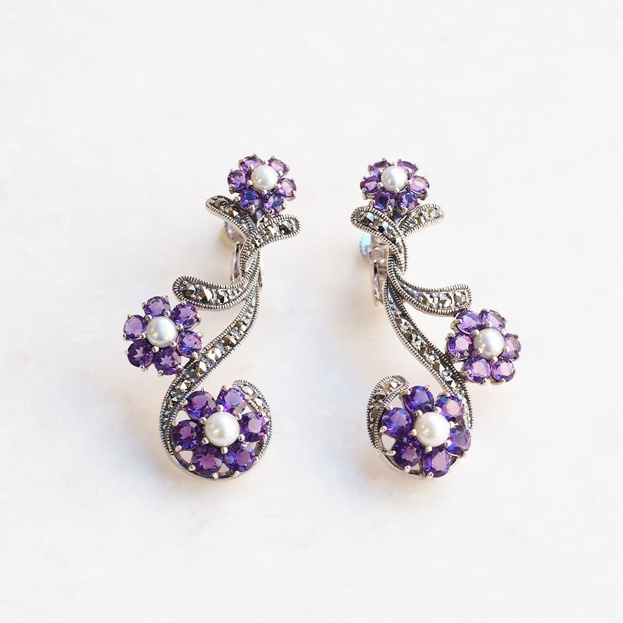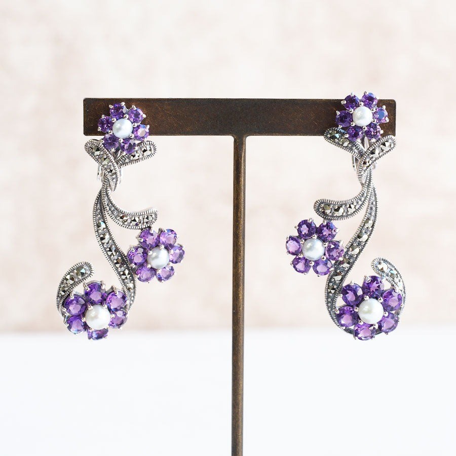 💜 2025-2026 銀飾運勢指南|紫晶花枝耳環(925銀 + 紫水晶 + 馬賽克石 + 珍珠)