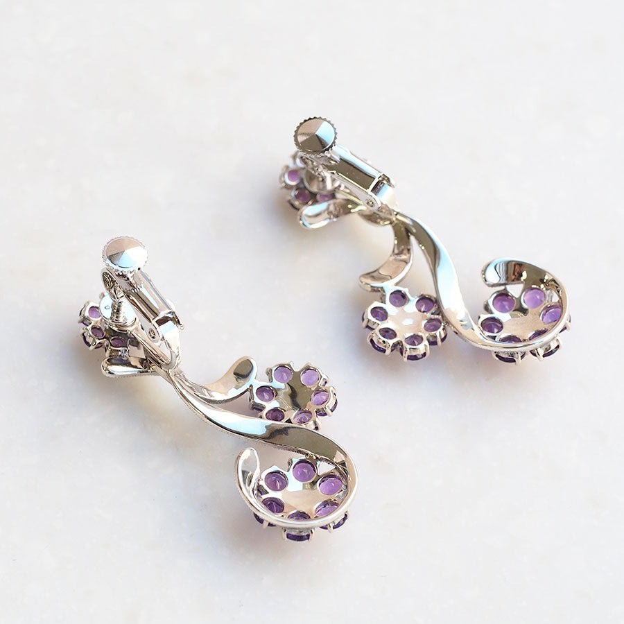 這是一對耳環,上面有三朵不同大小(大、中、小)的可愛紫水晶花朵綻放。花朵的中央有柔和閃亮的珍珠,嵌有馬卡賽石的金屬部分則表現出柔軟的葉子。沿著曲線輕巧地排列著花朵造型。清澈的紫水晶柔和紫色帶來花朵盛放的感覺,傳遞出溫暖季節的輕鬆愉快心情。希望這對耳環能成為您耳邊點綴快樂外出的好夥伴,也能加入您珠寶衣櫥的一部分。