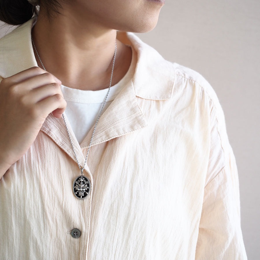 呢款吊墜掛飾上,有一幅喺漆黑瑪瑙畫布上盡情描繪嘅植物圖案,睇落好有印象。金屬框以細緻嘅珠飾點綴,而植物主題部分則施以精緻嘅微細刻紋,營造高雅而古典嘅氛圍。瑪瑙嘅光澤、珍珠芽的柔和白色,以及鐵白寶石沉靜嘅閃爍,組合出單色調嘅和諧感。同簡約嘅服飾配搭一樣好睇,或者同時尚或者哥德風嘅單色裝扮配搭都非常推介♪