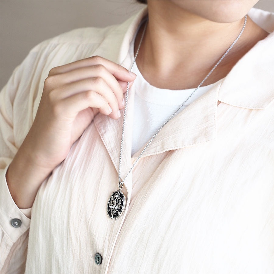 呢款吊墜掛飾上,有一幅喺漆黑瑪瑙畫布上盡情描繪嘅植物圖案,睇落好有印象。金屬框以細緻嘅珠飾點綴,而植物主題部分則施以精緻嘅微細刻紋,營造高雅而古典嘅氛圍。瑪瑙嘅光澤、珍珠芽的柔和白色,以及鐵白寶石沉靜嘅閃爍,組合出單色調嘅和諧感。同簡約嘅服飾配搭一樣好睇,或者同時尚或者哥德風嘅單色裝扮配搭都非常推介♪