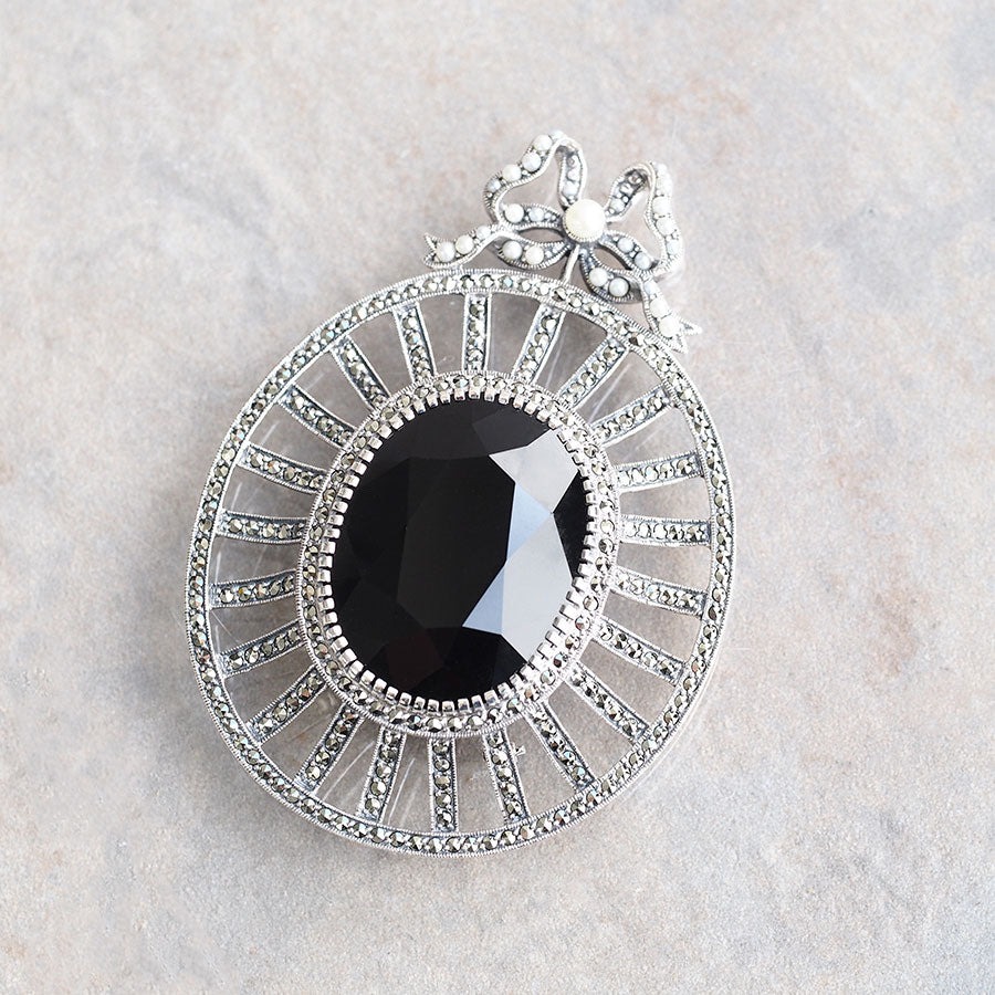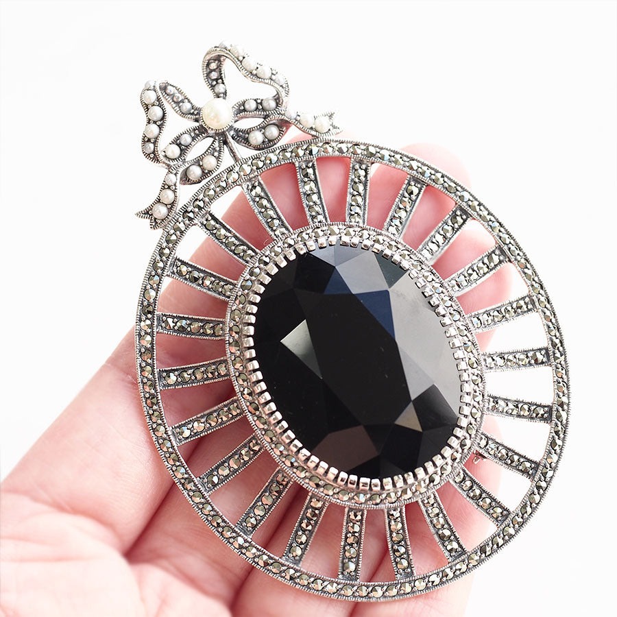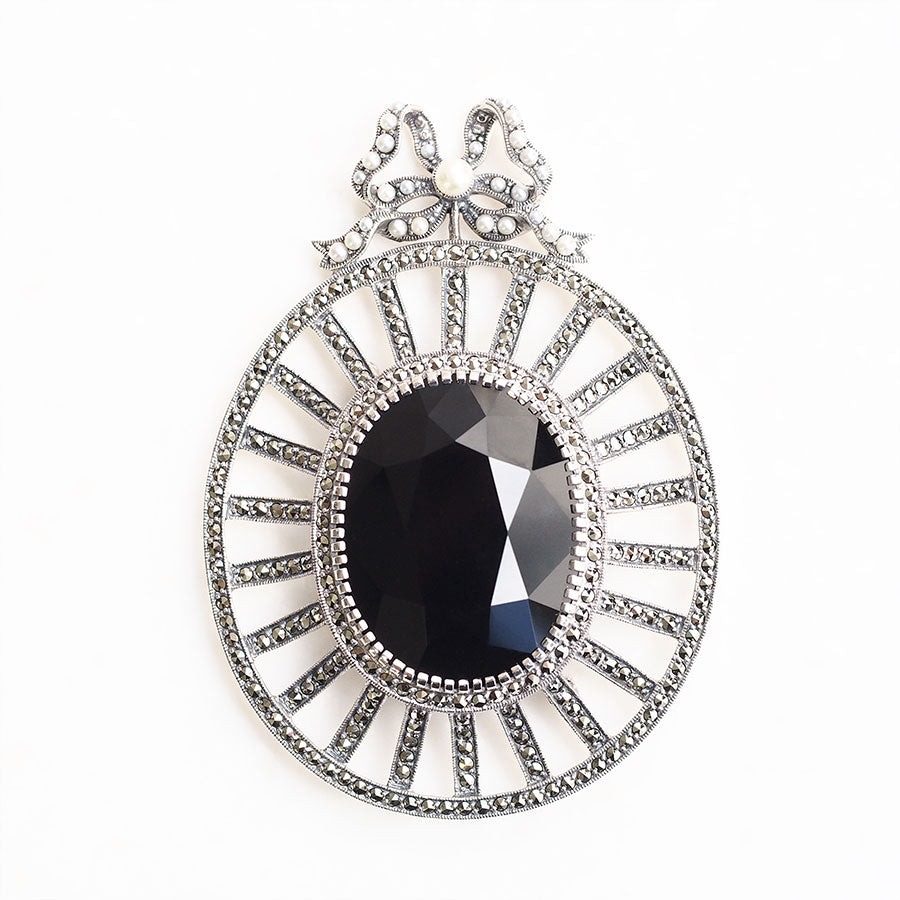 「縞瑪吸煞,蝴蝶結福」 您手上呢枚 925銀 + 黑縞瑪瑙 + 馬克賽石 + 珍珠 扇形胸針,五行金生水+土,主打 擋災化煞、事業權威、貴人加持、守財聚福、氣場全開 ✝️ Art Deco 復古風:黑縞瑪瑙橢圓主石(Onyx = 縞瑪瑙)+馬克賽石扇形線條+珍珠蝴蝶結,象徵「縞瑪鎮心+馬克賽閃貴+珍珠多福+銀生財」! 單用胸針:領口/西裝/襯衫,一針三戴! 無需開光,心誠則靈!即刻睇您嘅生肖可唔可以戴~