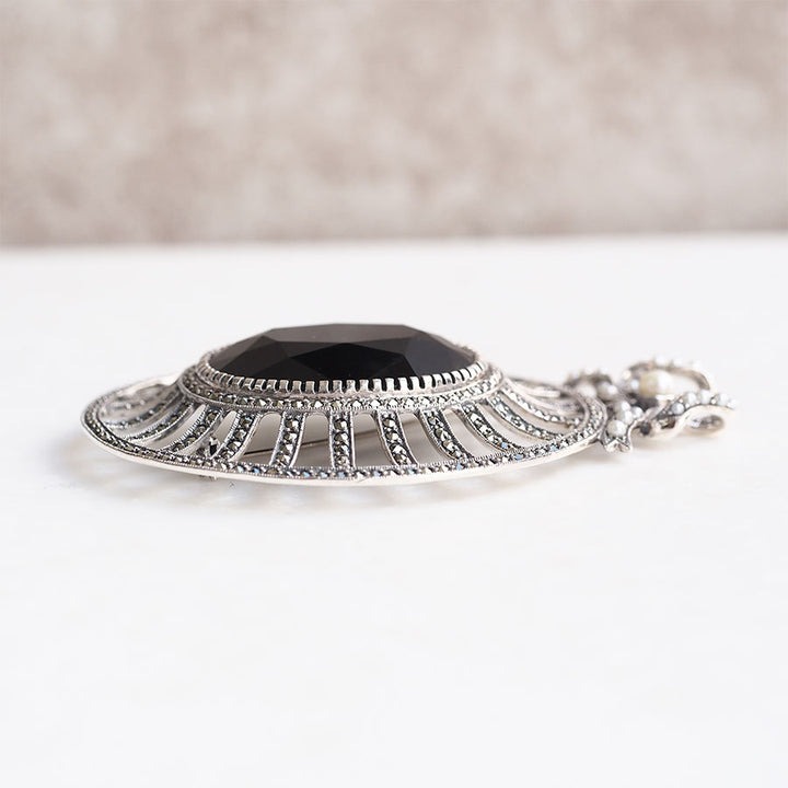 (925銀 + 黑縞瑪瑙 + 馬克賽石 + 天然淡水珍珠|Art Deco 扇形兩用)