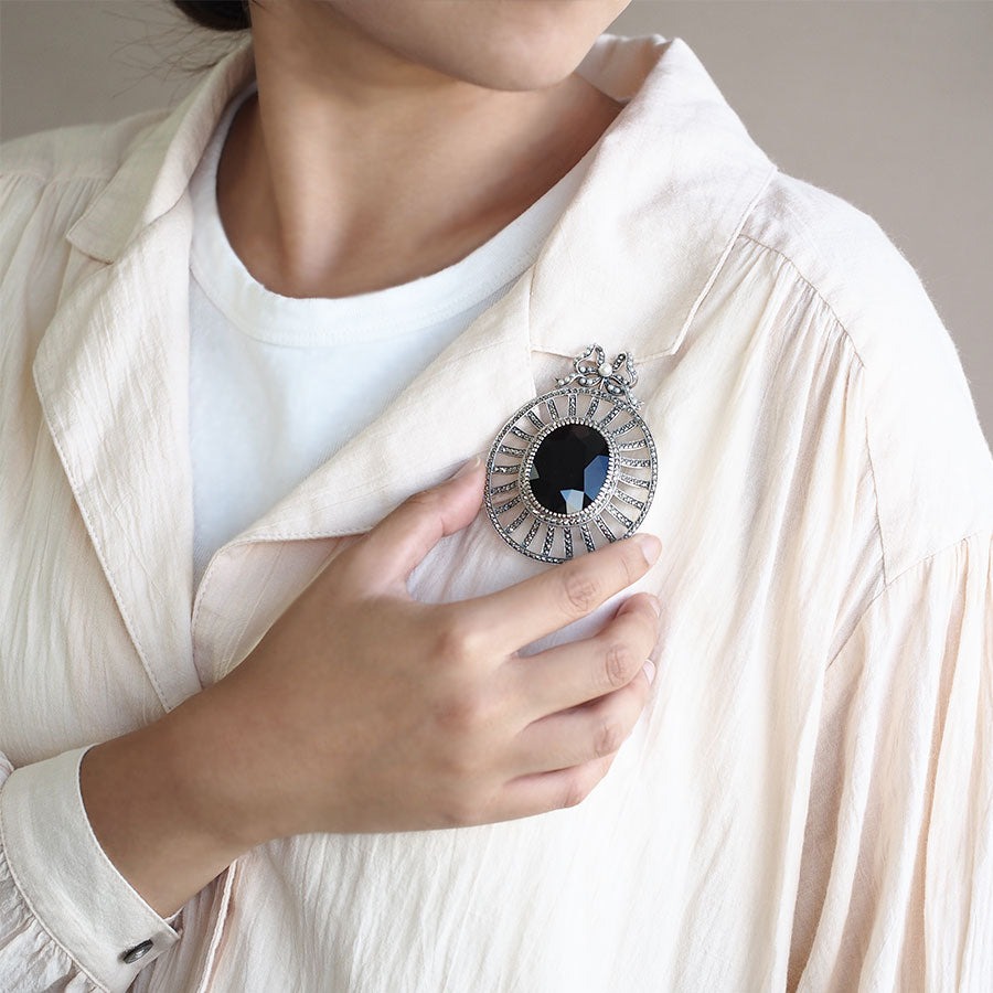 呢個胸針大得好似一枚勳章咁。由中心嘅瑪瑙散發出嚟嘅能量,無數粒馬卡石光線射出,好似放射狀咁擴散開。上面仲有珍珠做嘅緞帶♪令人感受到壓倒性嘅力量。係相當有存在感嘅一件配飾☆