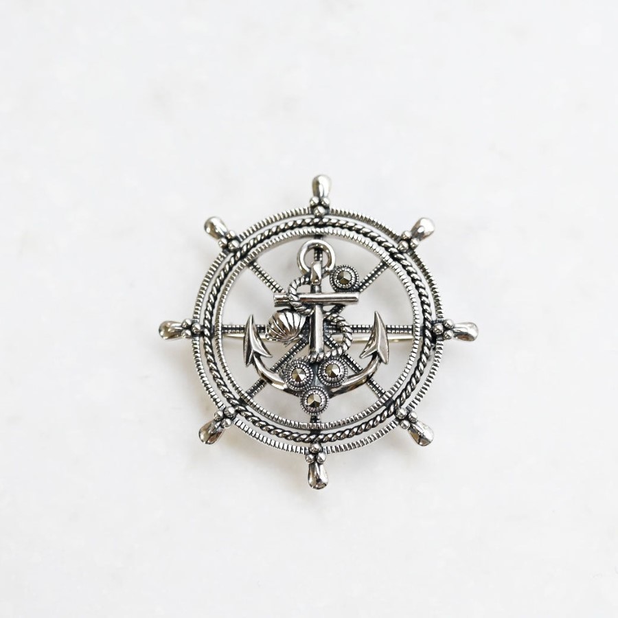 這是一枚精緻的胸針,設計上將用繩索工藝完成的舵輪(方向盤)中央置放閃亮的馬卡石錨。 這件浪漫的作品以美好人生的旅程為靈感,馬卡石增添了璀璨光芒,而錨上的小貝殼則成為可愛的點綴。在歐洲,舵輪象徵「掌握人生方向」,錨則象徵穩定與安全。佩戴它似乎能帶來克服困難、平安渡過的正向能量。這件飾品運用能讓人感受到大海氣息的繩索工藝與古典的磨光工藝精細製作,無論正式場合還是休閒穿搭都非常適合。既可以作為胸針佩戴,也可將您自己的鍊子穿過作為項鍊享用。