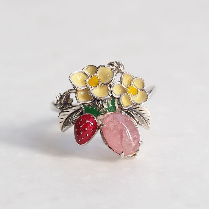 呢款戒指係受著名植物畫家盧杜特(Pierre-Joseph Redouté)嘅作品《草莓(Fragaria chiloensis)》啟發而設計,呢位畫家喺植物畫中追求精準,同時能表現出富有情感嘅細膩美,被譽為「花中拉斐爾」嘅畫家。戒指色彩繽紛,可愛迷人。盧杜特喺18世紀後期至19世紀中期喺法國活躍,係宮廷畫家,以「玫瑰畫家」「花卉畫家」聞名。佢曾獲瑪麗安托瓦內特同拿破侖皇后約瑟芬賞識,創作出大量優美花卉畫作。佢嘅花卉作品透過高超嘅銅版雕刻技術同細緻手彩上色呈現,細膩精緻,兼具藝術性,作為博物畫集獲高度評價。戒指上嘅粉紅寶石 Inca Rose 色澤飽滿可愛,喺琺瑯顏色嘅選用上特別講究,經過多次試作,最終呈現華麗而優雅、同時帶點可愛嘅完美平衡。草莓嘅葉子同果實立體細緻,畫面生動,使呢款首飾非常適合成熟女性配戴,成為一件既細膩又充滿生氣嘅主題珠寶。