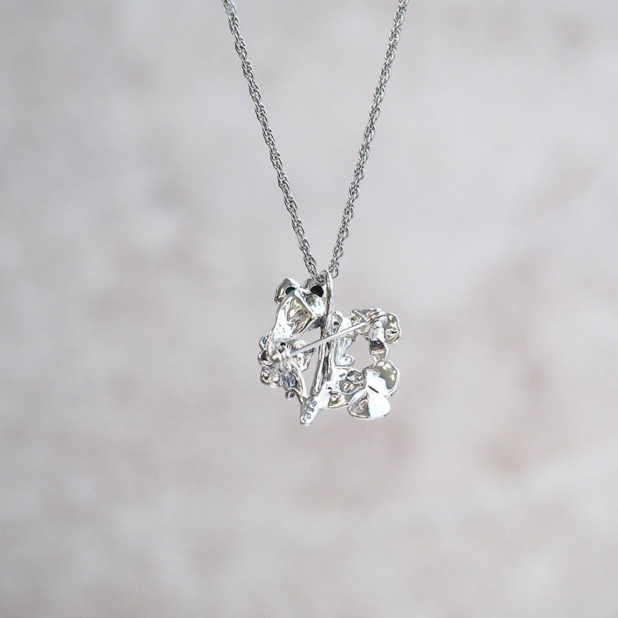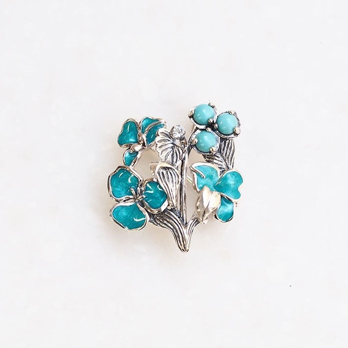 呢款吊咀胸針嘅設計靈感來自被稱為「花之拉斐爾」嘅畫家皮埃爾·約瑟夫·盧杜特繪畫嘅「露草」植物畫,以需要高度精確嘅植物畫手法展現充滿情感嘅細膩美麗,色彩繽紛而可愛。皮埃爾·約瑟夫·盧杜特係18世紀後期到19世紀中期喺法國活躍嘅宮廷畫家,以「玫瑰畫家」同「花卉畫家」聞名,佢曾得到瑪麗·安東妮同拿破崙皇后約瑟芬嘅賞識,留低咗大量優雅花卉作品。佢透過高超嘅銅版畫技術同細膩嘅手工上色表現花卉,使作品細緻而洗練,亦具有藝術性,被高度評價為博物圖譜。呢件作品選用同綠松石清新藍色相配嘅稍深而寶石無法呈現嘅鮮明藍色琺瑯,多次試作完成。仔細睇,藍色琺瑯入面含有細微閃粉,呈現出單靠深藍色無法達到嘅高貴色澤。葉面上刻畫嘅葉脈紋理,加上琺瑯光澤嘅立體感,營造對比效果,使作品更加美麗。雖然細小,但用清晰色調藍色組合嘅首飾,可以作為搭配嘅點綴佩戴。