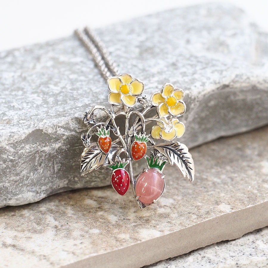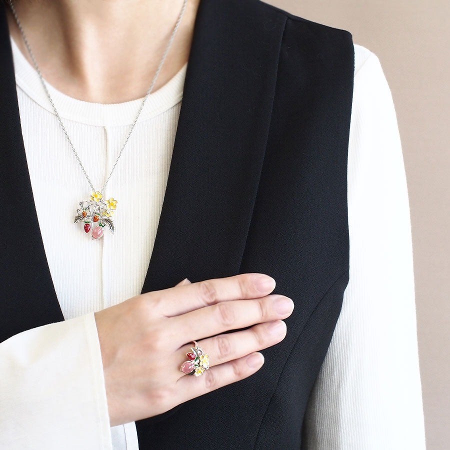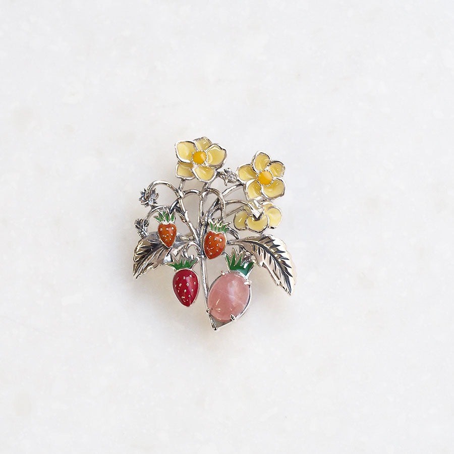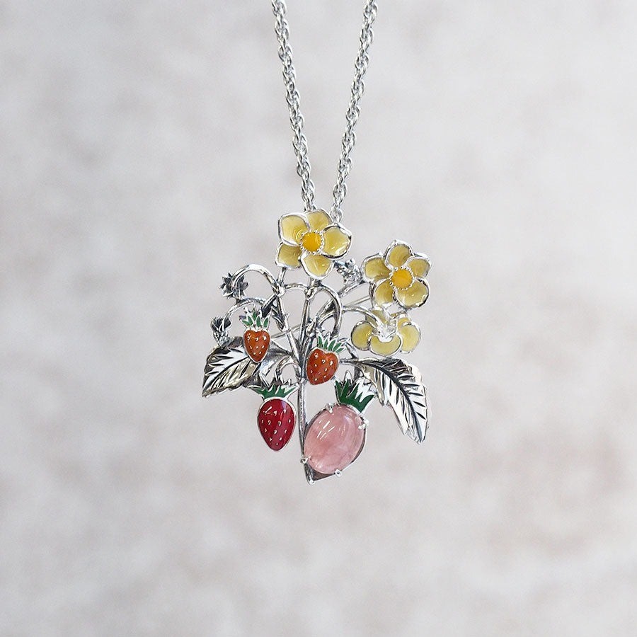 呢款花卉胸針吊墜[草莓(Fragaria chiloensis)],靈感來源於被稱為「花之拉斐爾」嘅畫家路杜特(Pierre-Joseph Redouté)嘅植物畫作。喺需要精準描繪嘅植物畫中,路杜特表現咗情感充沛而又細膩嘅美。皮耶爾·喬瑟夫·路杜特係18世紀後期至19世紀中葉活躍於法國嘅宮廷畫家,以「玫瑰畫家」同「花卉畫家」聞名。他得到瑪麗·安東尼皇后同拿破崙皇后約瑟芬嘅賞識,創作咗大量優雅嘅花卉作品。透過高級嘅銅版畫技術同仔細嘅手工上色,佢嘅花卉畫細膩而精緻,兼具藝術性,被高度評價為博物圖譜。胸針用色飽滿可愛嘅印加玫瑰石,喺琺瑯顏色嘅製作上非常講究,多次試作,最終呈現出華麗、高雅,又帶少少可愛感嘅平衡。草莓嘅葉子同果實立體細緻,畫面生動,使呢款首飾非常適合成熟女性配戴,成為一件既細膩又充滿生氣嘅主題珠寶。