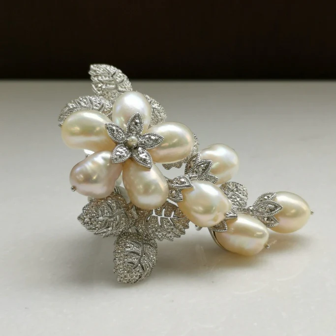 以英國古董珠寶的玫瑰胸針作為範本設計。利用密釘工藝和各種紋理,加上立體製作,打造出具有存在感的作品。豪華地使用大型巴洛克珍珠,個性豐富的巴洛克珍珠生動表現出獨一無二的花朵表情。設計方便易用,非常適合在典禮場合佩戴,能瞬間提升整體造型的華麗感。此商品表面已鍍上銠。 商品管理番号 506C0198 サイズ 約44×66mm 素材 SV925 Pearl 注意事項 ※請注意,由於使用天然石材,因此可能存在個體差異、天然裂縫和內含物,並且實際天然石材的顏色可能會因瀏覽器而異。 ※不含鏈條 請按讚:喜歡 正在載入...