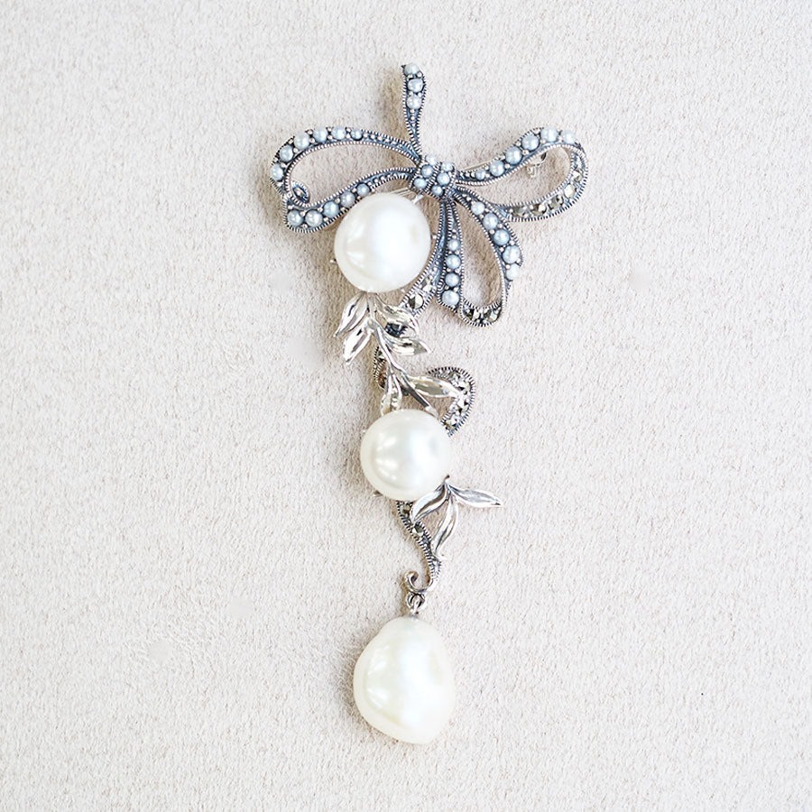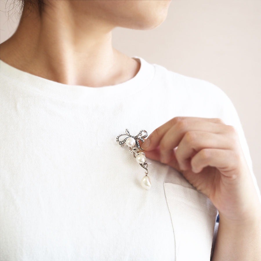 每一粒都各有表情的巴洛克珍珠,用了三粒,非常奢華的別針。大小珍珠的尺寸對比非常明顯。柔美的緞帶設計上點綴了小珍珠和閃亮的馬卡石。下方可隨動搖晃的部分則配上了巴洛克珍珠。框線與白色閃亮的珍珠營造出溫柔的印象。