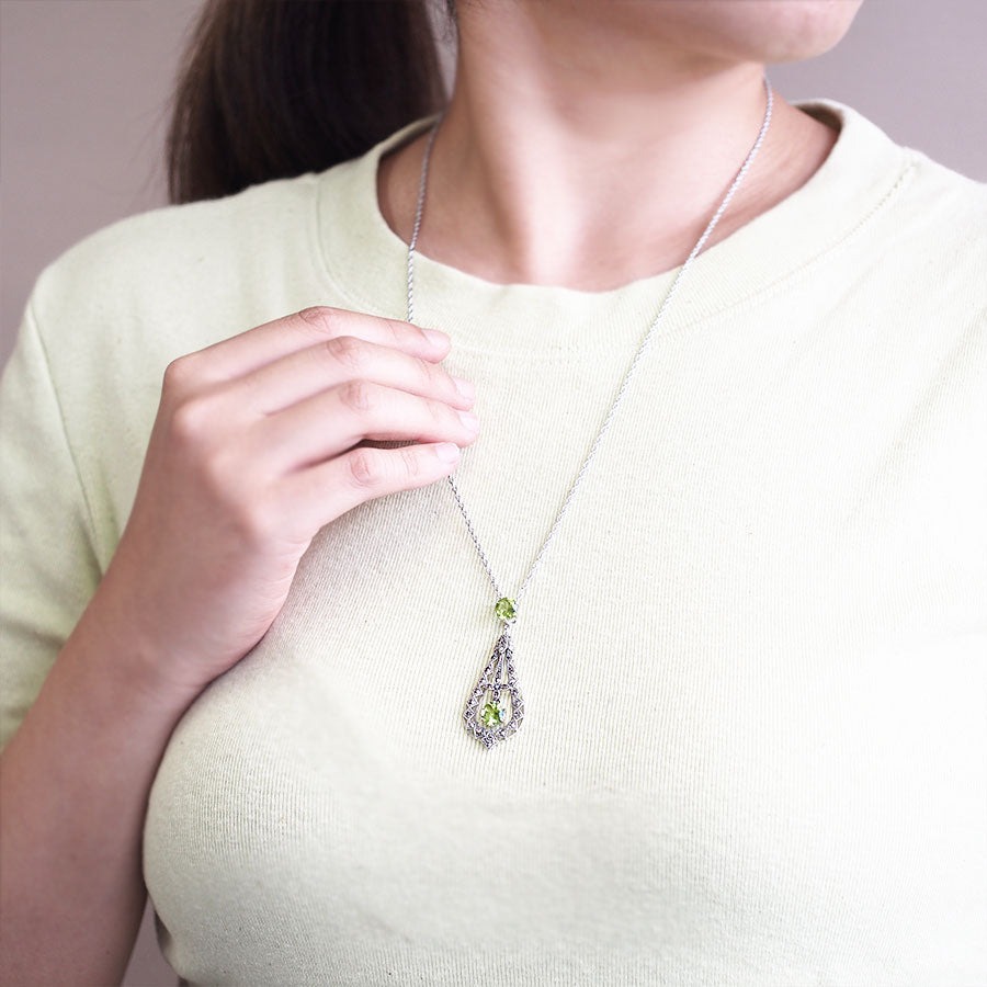 💧💚 2025–2026「雙滴橄欖雨」復古馬克賽石橄欖石長吊墜 (925銀+兩顆超大圓形切割天然橄欖石Peridot+滿鑲馬克賽石+會搖晃的立體水滴花籠) 「一戴即變1920年代蒂芙尼櫥窗裡那滴會呼吸的晨露,低頭一晃直接回到《了不起的蓋茨比》雛菊在湖邊等你的畫面,行出街100%被問:你條頸鏈係博物館借出嚟拍戲呀?!」 五行屬:超強木+金+水,主打:正緣桃花爆棚、已婚夫妻感情升溫到黏黏、事業人緣一路開綠燈、犯太歲都能優雅到發光、氣場自帶晨間薄霧濾鏡