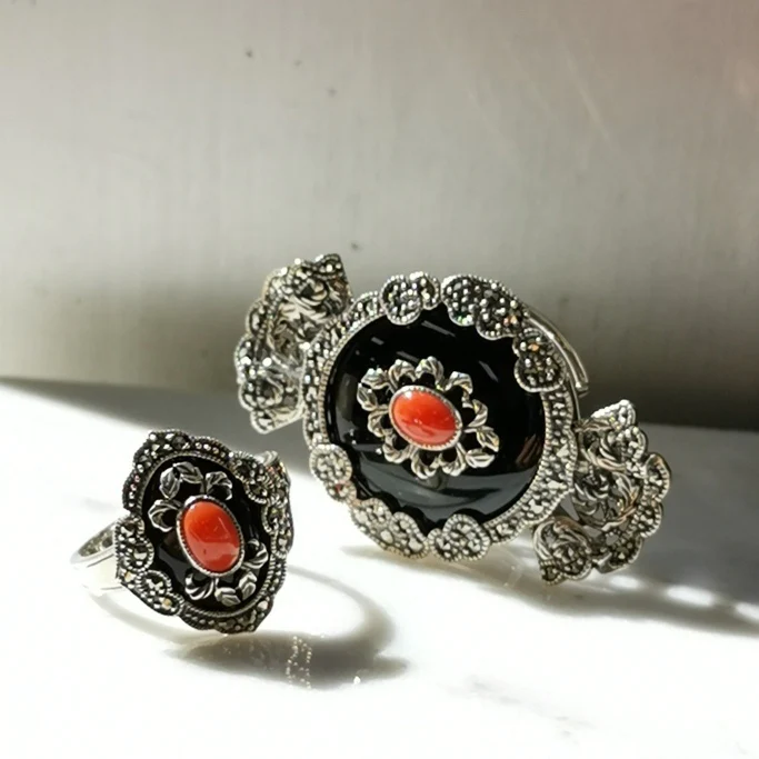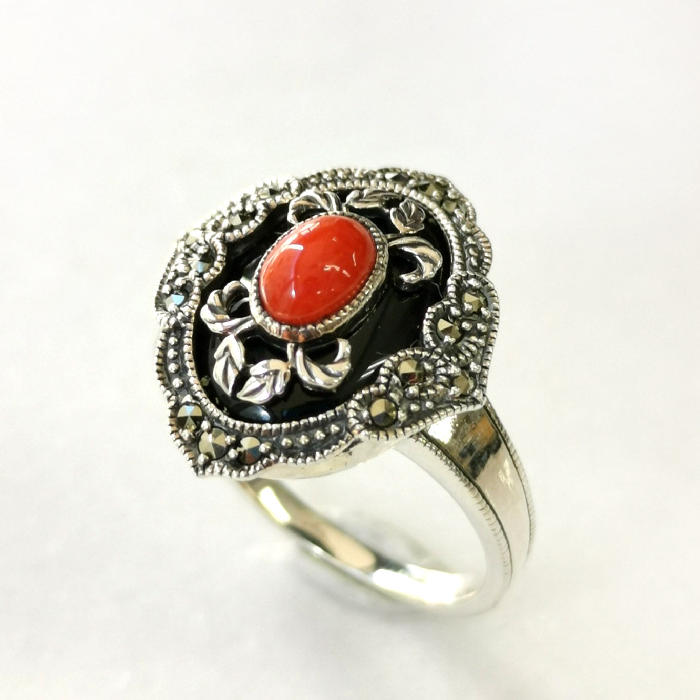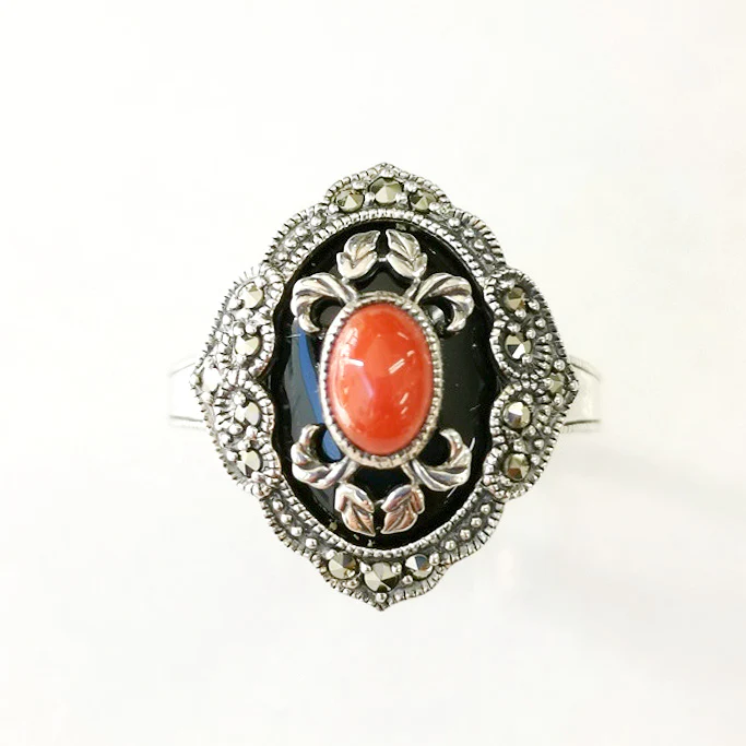 將鮮紅色珊瑚配搭鮮明的黑色縞瑪瑙,營造出新鮮的色彩對比,非常美麗的戒指。