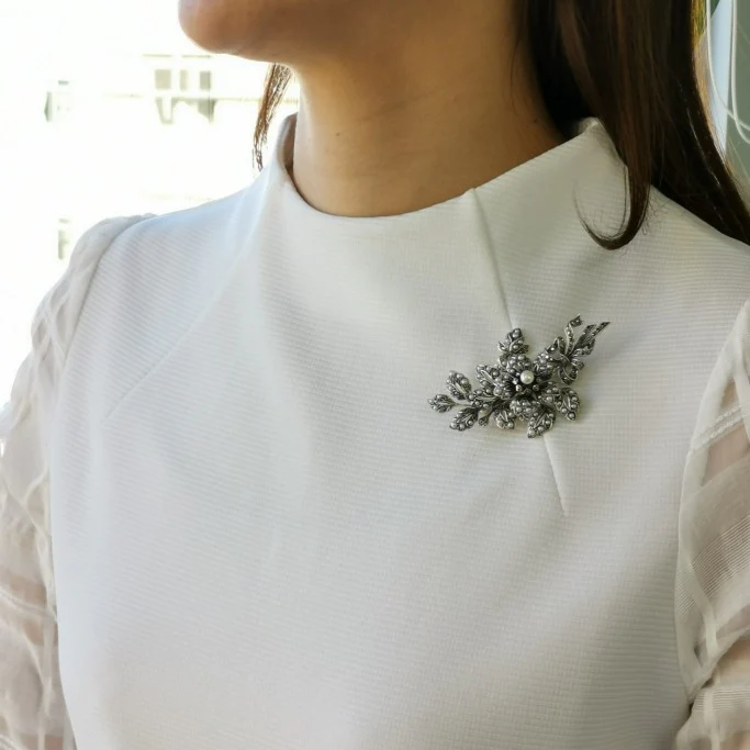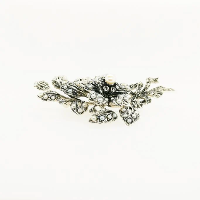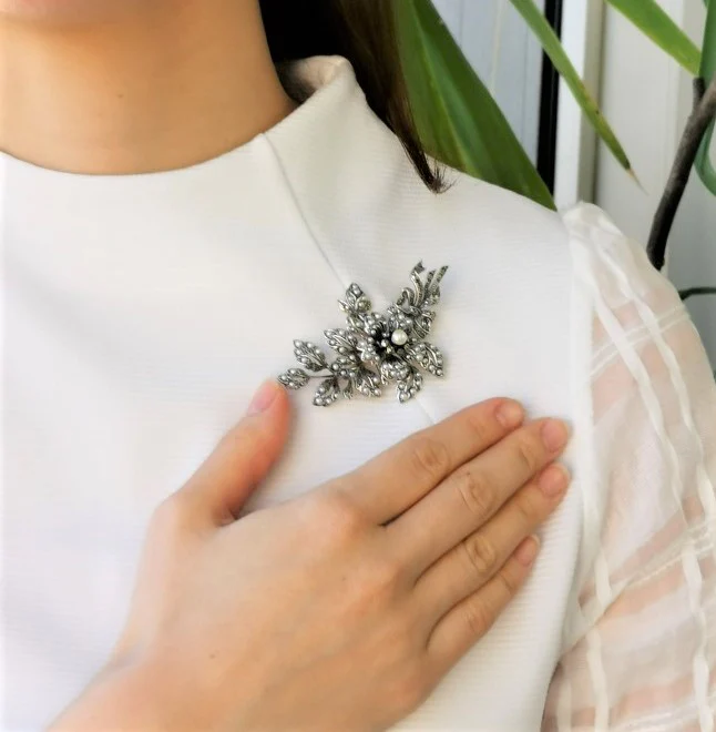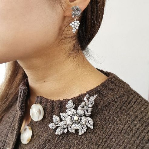 大量使用淡水珍珠同種子珍珠嘅花束胸針。中央嘅花設計得比較高,做咗立體效果。緞帶上面有馬卡石點綴,增加閃亮感。 商品管理番号 204C0331 サイズ 約75×45mm 素材 SV925 Marcasite、Pearl 注意事項 ※請注意,由於使用天然石材,因此可能存在個體差異、天然裂縫和內含物,並且實際天然石材的顏色可能會因瀏覽器而異。 ※不含鏈條 請按讚:喜歡 正在載入...