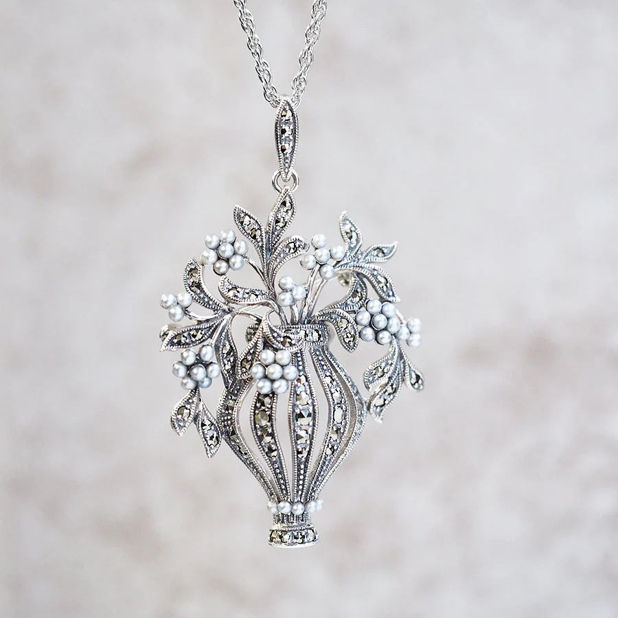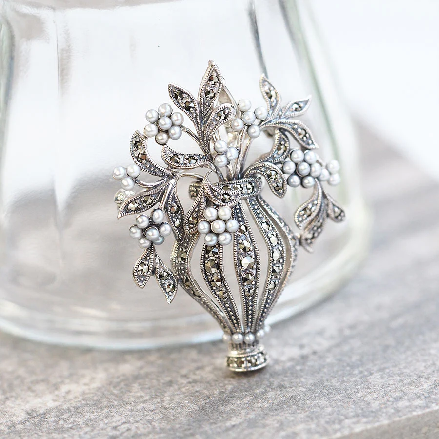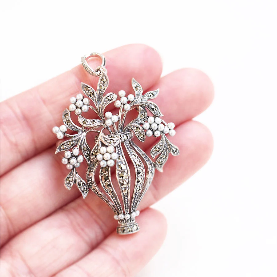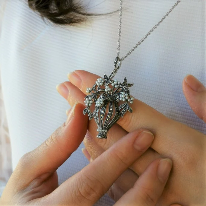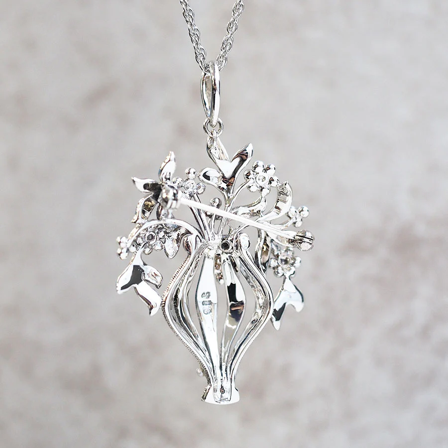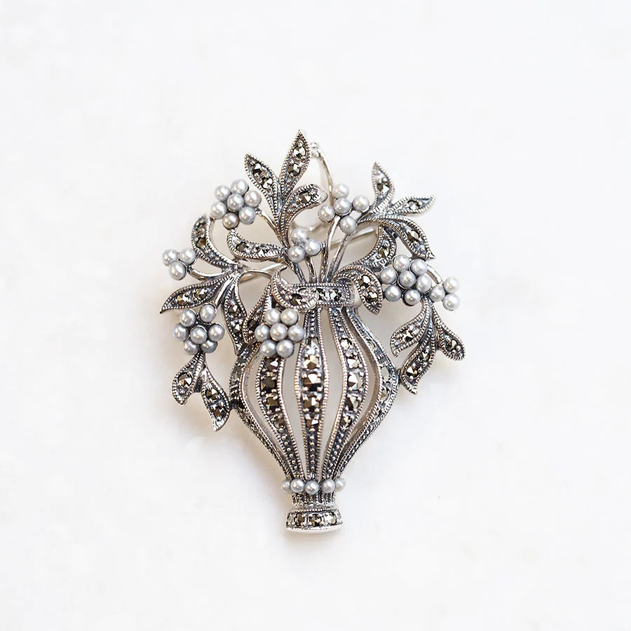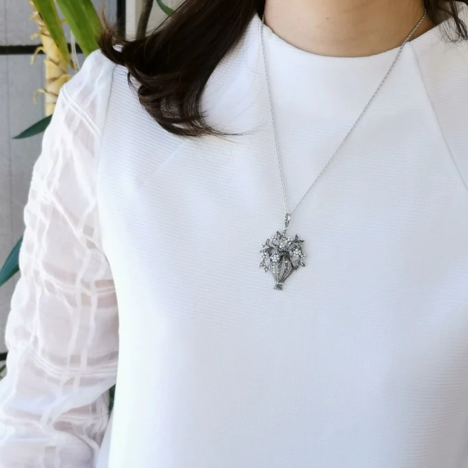 有如真品古董珠寶般堂堂正正的氣派。 將葉子插入馬爾卡石花瓶時葉片的柔美起伏,以及大量使用的珍珠花卉所展現的豐富表情,都是充滿氣質的作品。 由於可以隱藏扣釦,因此可以作為西裝外套或大衣的胸針使用,是一件非常高雅的單品。 請按讚:喜歡 正在載入...