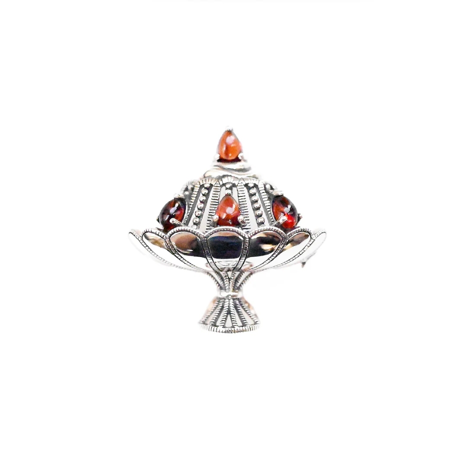 精緻嘅鏤空工藝能反射光線,散發高貴嘅光澤。以石榴石雕成嘅雙梨形浮雕象徵草莓,深紅色為成熟女人增添魅力,極具存在感。而且,呢款別針可以作為吊墜使用,係雙用設計,可以為每日穿搭增添華麗感。