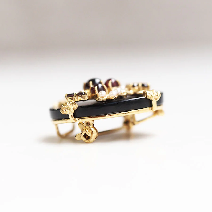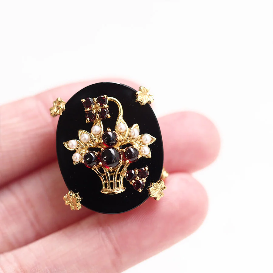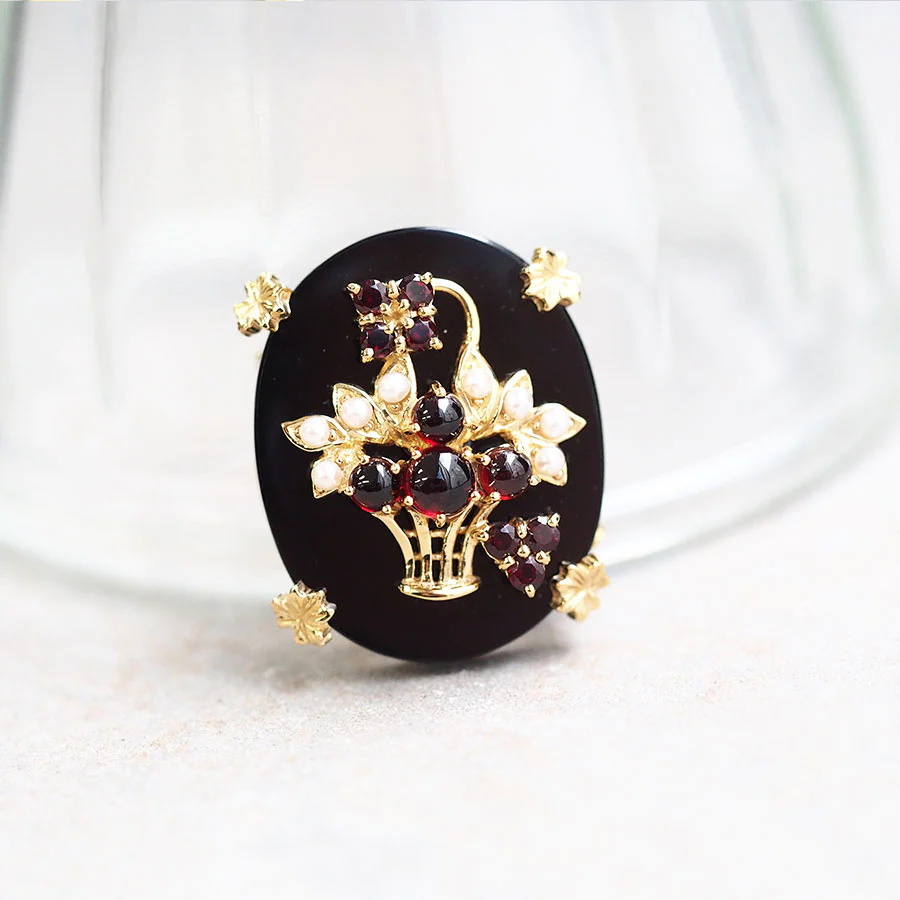 將用寶石製成的花籃置於光亮的縞瑪瑙上,如畫般的吊墜胸針。