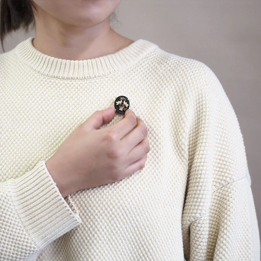 由光滑的蛋面切割石榴石製作的小花和果實閃耀著光澤,與珍珠乳白色柔和光澤融合在縞瑪瑙之上,營造出優雅的氛圍♪