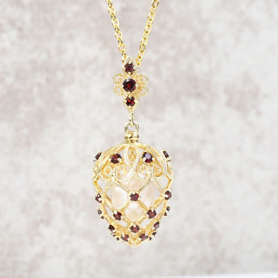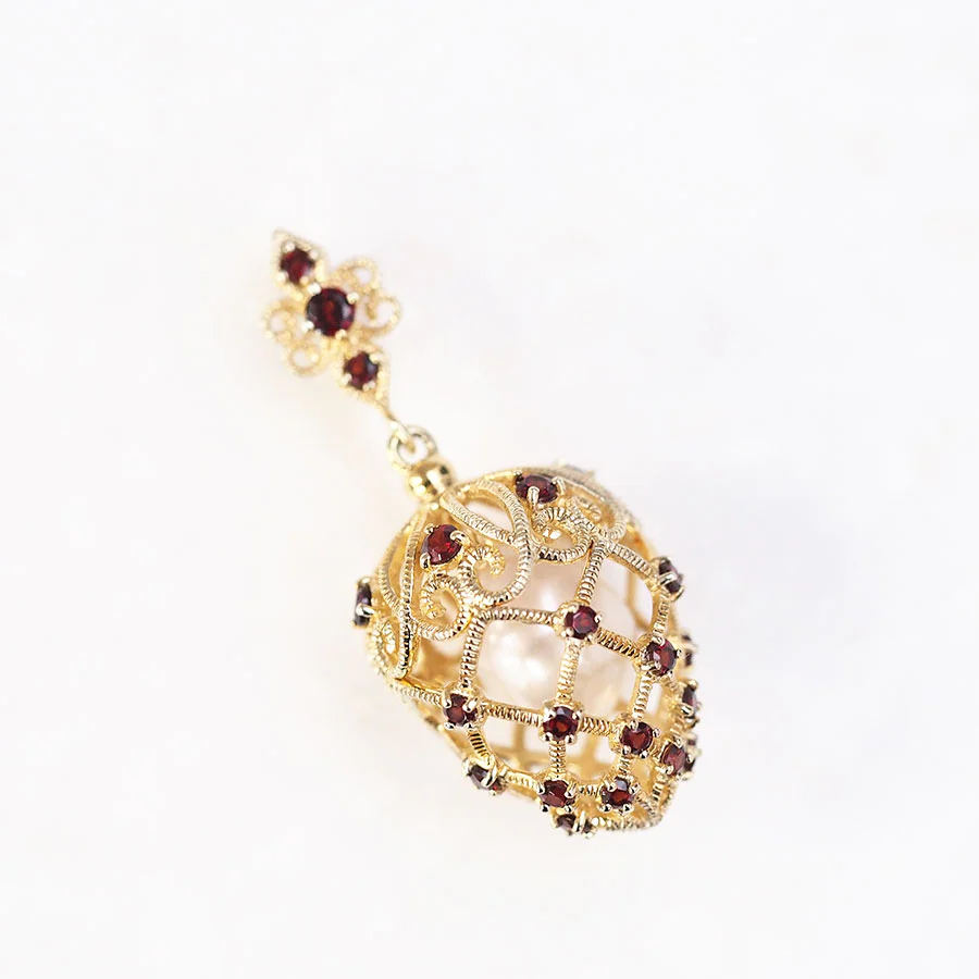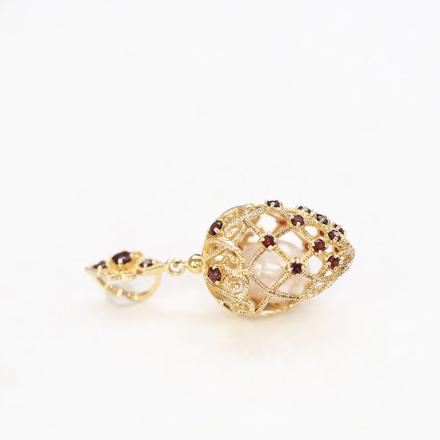 柔和光澤嘅珍珠同帶有溫暖感覺嘅石榴石組合,喺金色調上面形成咗好突出嘅對比效果。