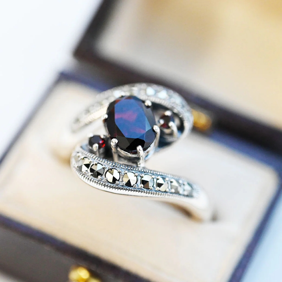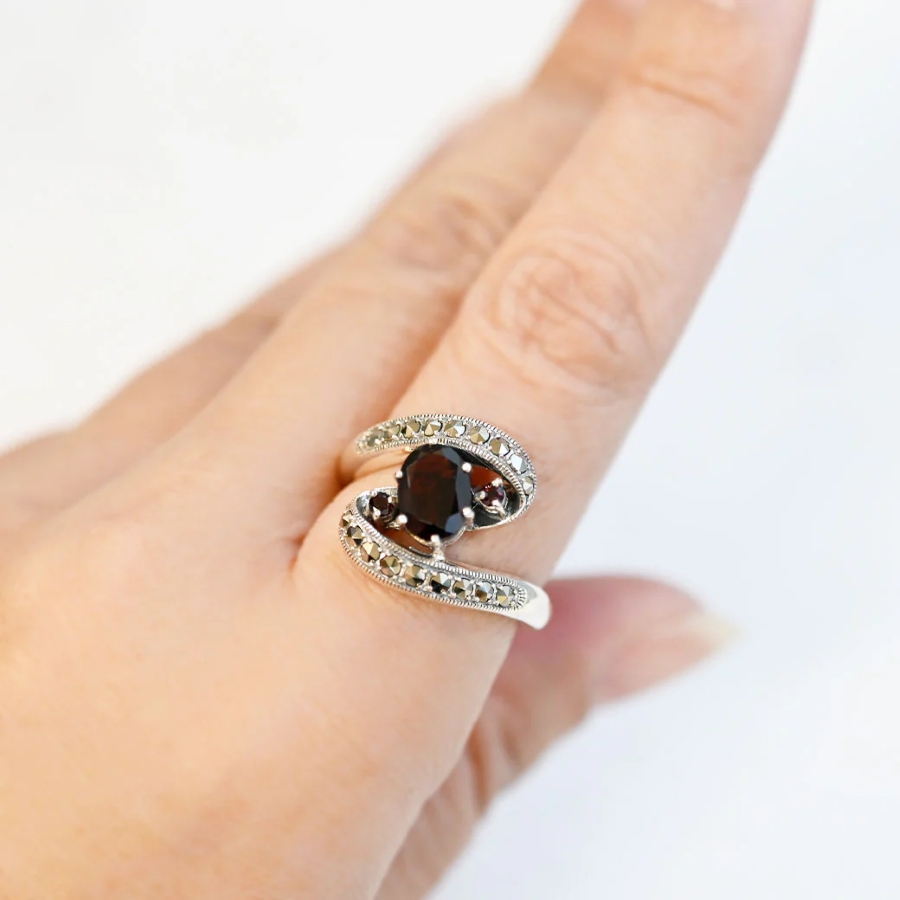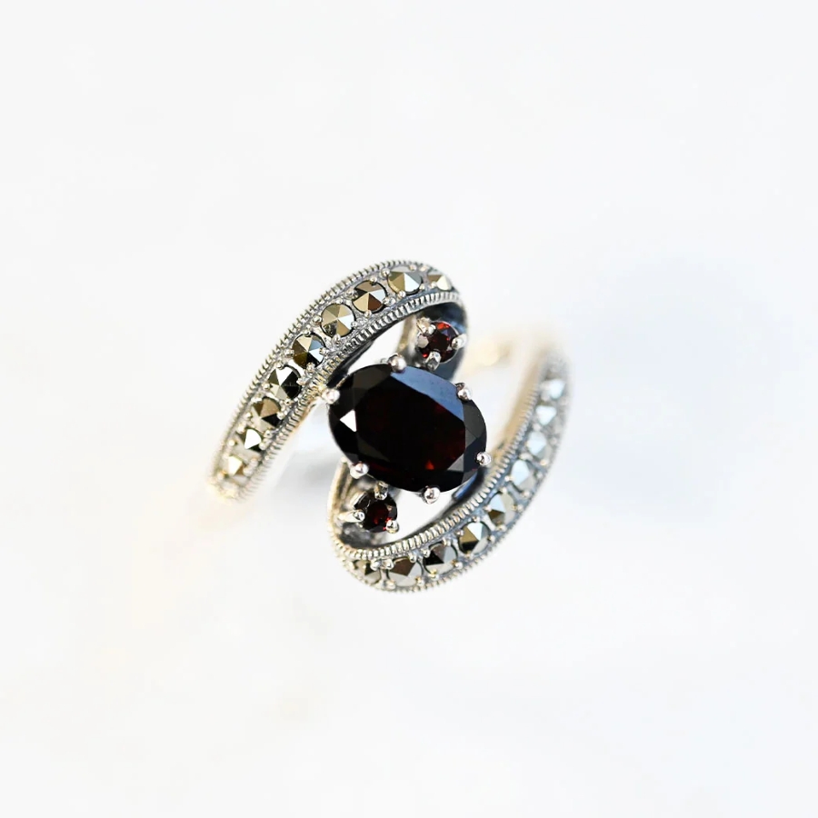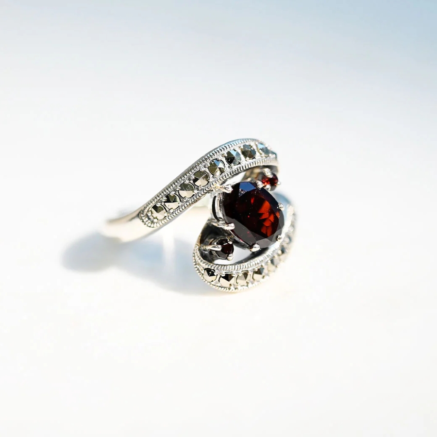 這枚戒指的特色在於將深紅色的石榴石與增添光澤的馬卡石結合,呈現出優雅的設計。中央鑲嵌的石榴石以深紅的光芒為手部增添華麗感。環繞周圍的馬卡石散發出古典而高雅的光澤,使整體印象更加突出。