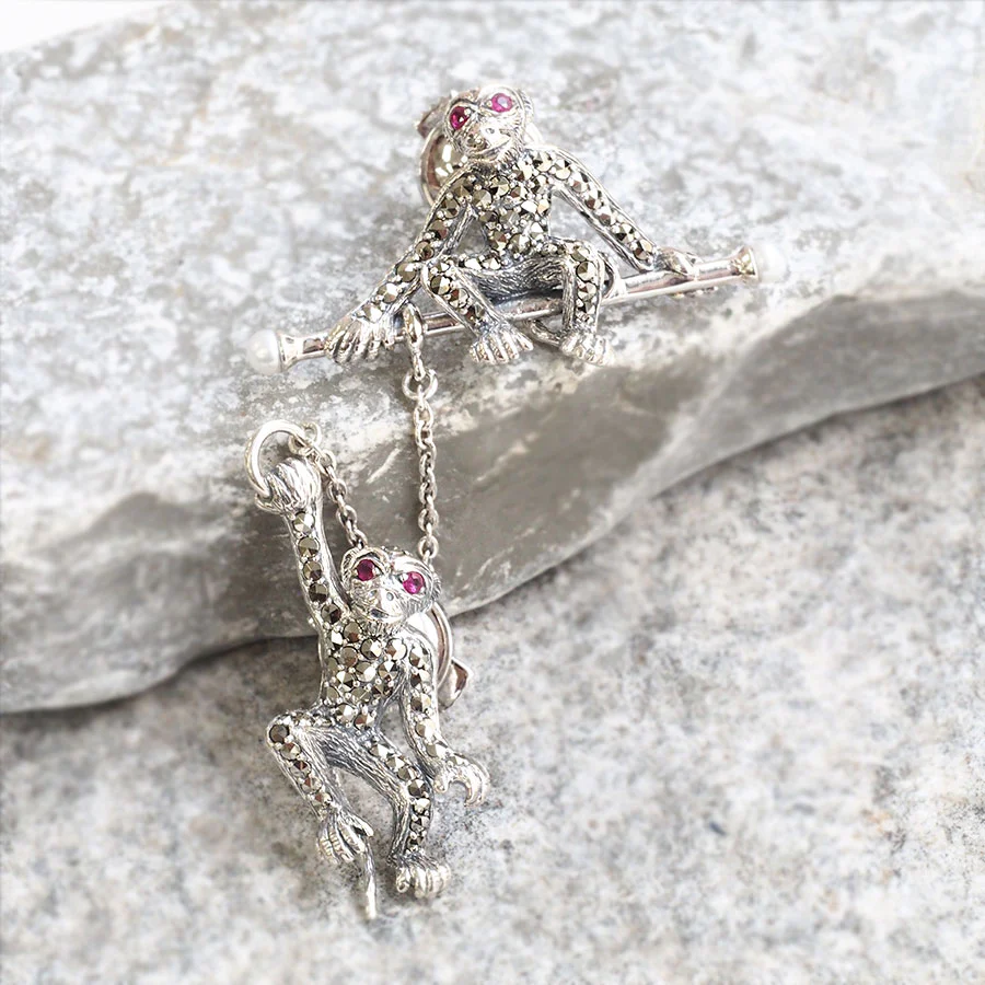 🧧🐒 2025–2026「紅寶眼雙猴吊鏈胸針」最兇最靈猴王情侶款 (925銀+4粒天然紅寶石Ruby眼睛+滿身馬克賽石+一隻坐桿一隻吊鏈真的會晃!+上下各一顆日本Akoya珍珠=一戴直接變齊天大聖他女朋友) 「別人戴胸針是貴婦,妳戴這隻是整條街最兇的猴王妃!一晃一晃兩隻紅眼小猴直接幫你把2025犯太歲的霉運甩飛八百里!」 五行屬:火+最強金+動能風,主打:動則發財、動則脫單、動則小人自動滾、屬猴本命年直接變大聖附體