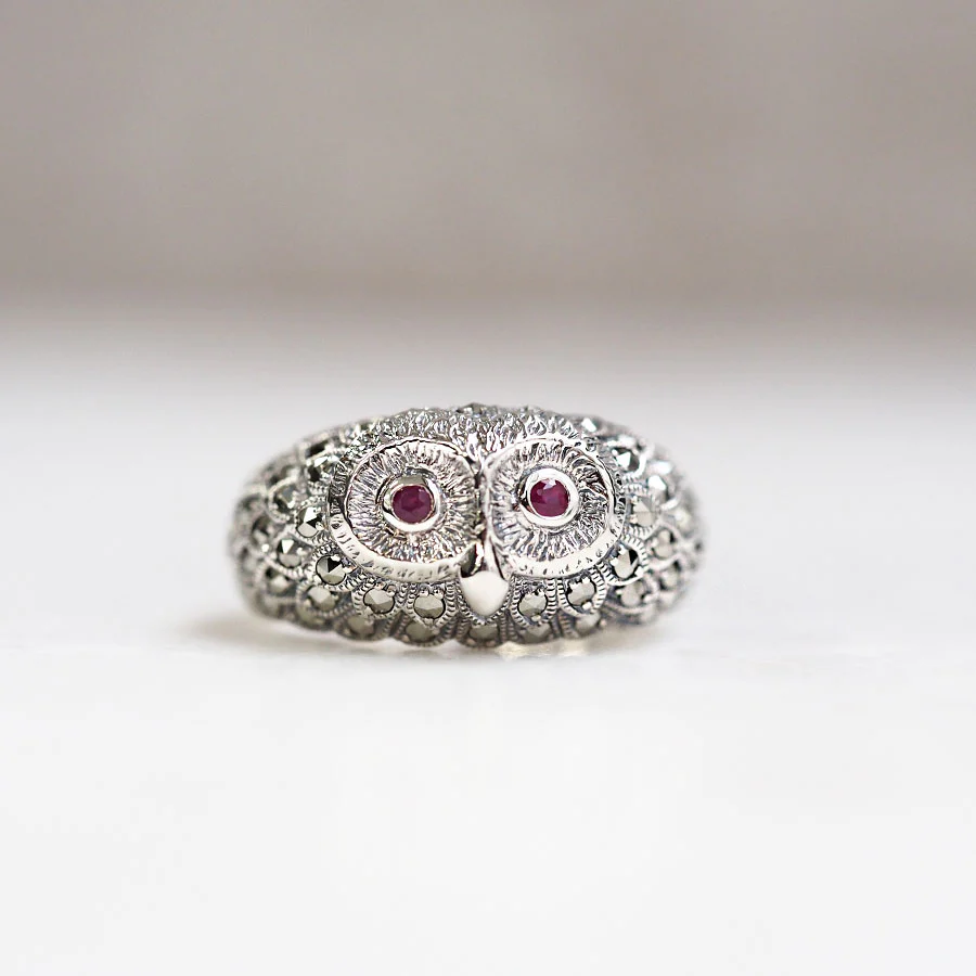 貓頭鷹喺歐洲因為佢嘅外貌同智慧嘅眼神,一直被視為「智慧・賢者」嘅象徵而受人喜愛。 喺英國,佢被視為「森林守護神」同智慧嘅象徵,而喺希臘同墨西哥,據講又係「財富嘅象徵」。 日本亦因為名字而被認為係帶來「不苦勞」同「福氣」嘅吉祥鳥。 呢件長賣商品,Ruby 嘅眼同 Marcasite 嘅羽毛工藝非常出色。