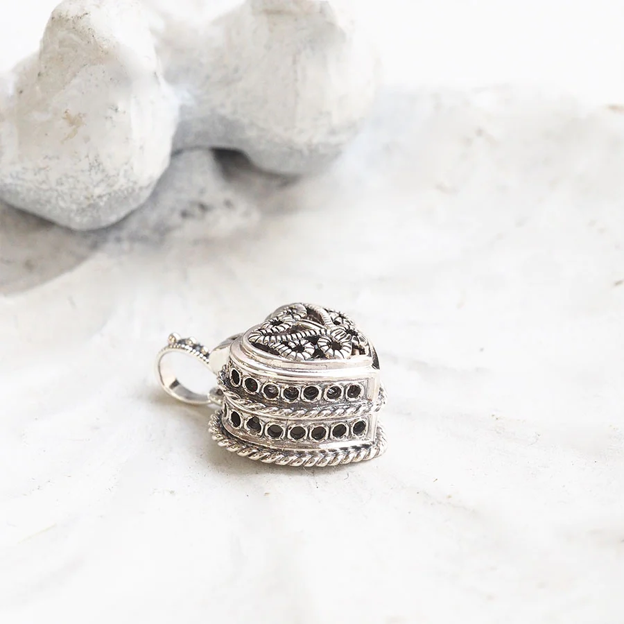 打開心形盒子,裏面有只屬於你嘅秘密戒指。偶爾打開確認,戒指中間嘅寶石顏色,就好似你嘅心一樣,係深粉紅色。呢個吊墜頭設計模仿咗心形戒指盒,中央鑲咗一粒紅寶石嘅戒指。精緻嘅鏤空設計同繩紋樣都帶有古典感,而且細細個,好容易搭配唔同嘅衣服,係店員之中都好受歡迎嘅作品。