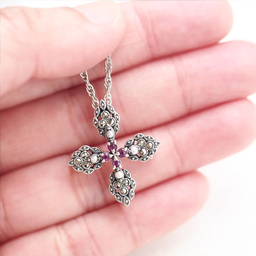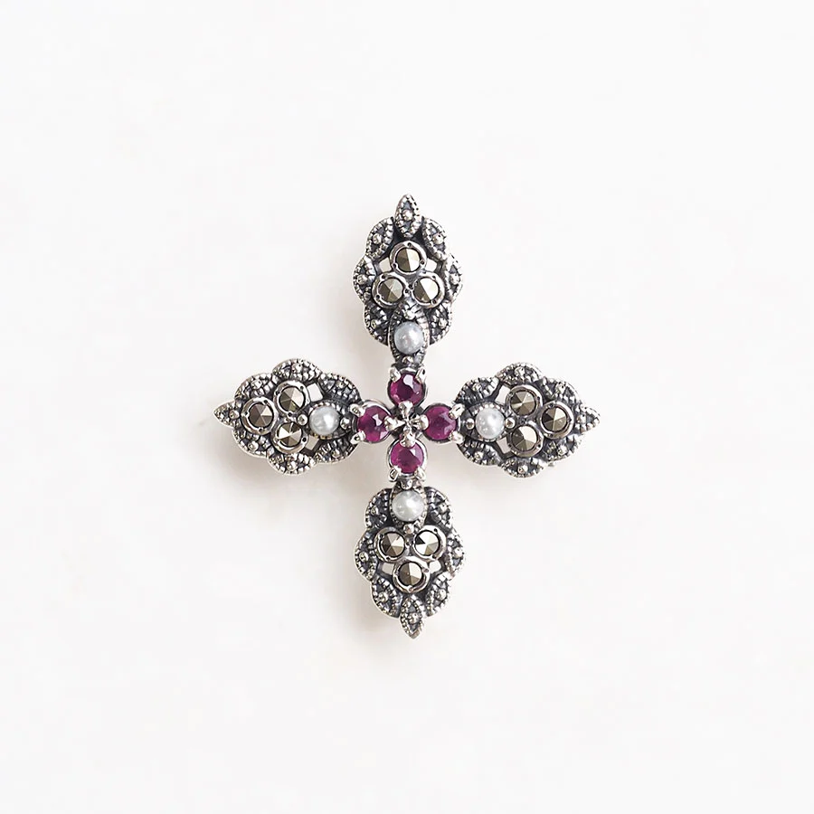 【Made in Japan】 SV系列 紅寶石與珍珠優雅十字架吊墜胸針