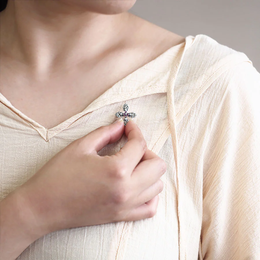 ✝️🔥 2025–2026「聖焰紅十字」復古紅寶石十字架兩用墜/胸針 (925銀+4粒天然紅寶石Ruby+4顆日本Akoya種子珍珠+滿圈馬克賽石+葉脈雕花+可吊可別=一物兩戴) 「一戴即變《梵蒂岡的玫瑰》女主角,鎖骨一閃直接回到中世紀貴族祈禱現場,行出街100%被誤認是某個古老歐洲家族的聖女轉世!」 五行屬:最強火+金+水,主打:擋爛桃花+擋小人+擋災+擋一切負能量、犯太歲直接變最強守護神、氣場自帶聖光濾鏡