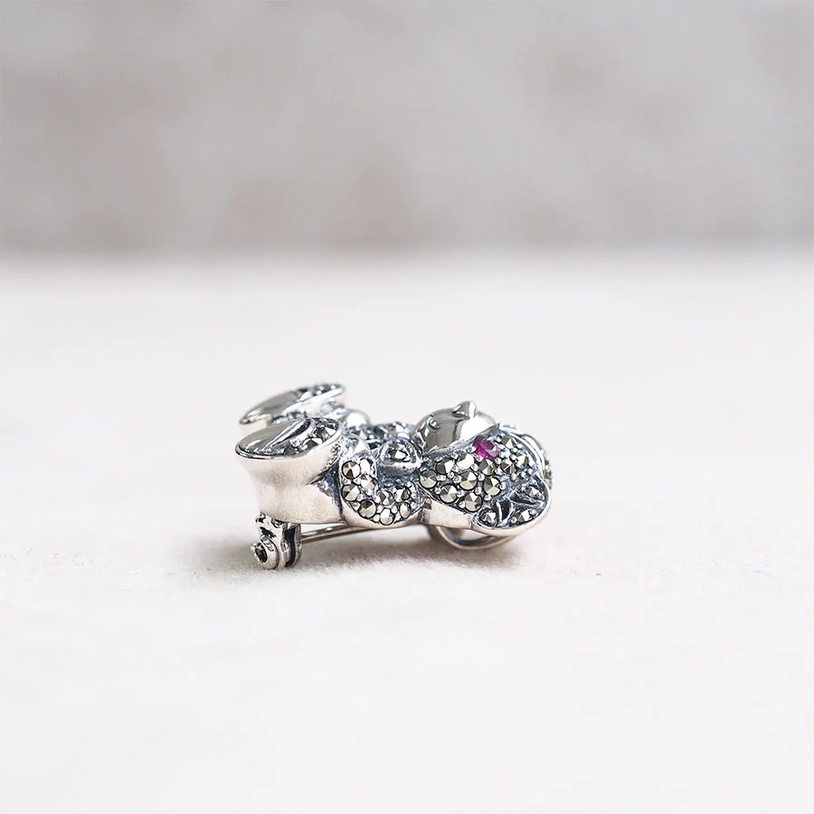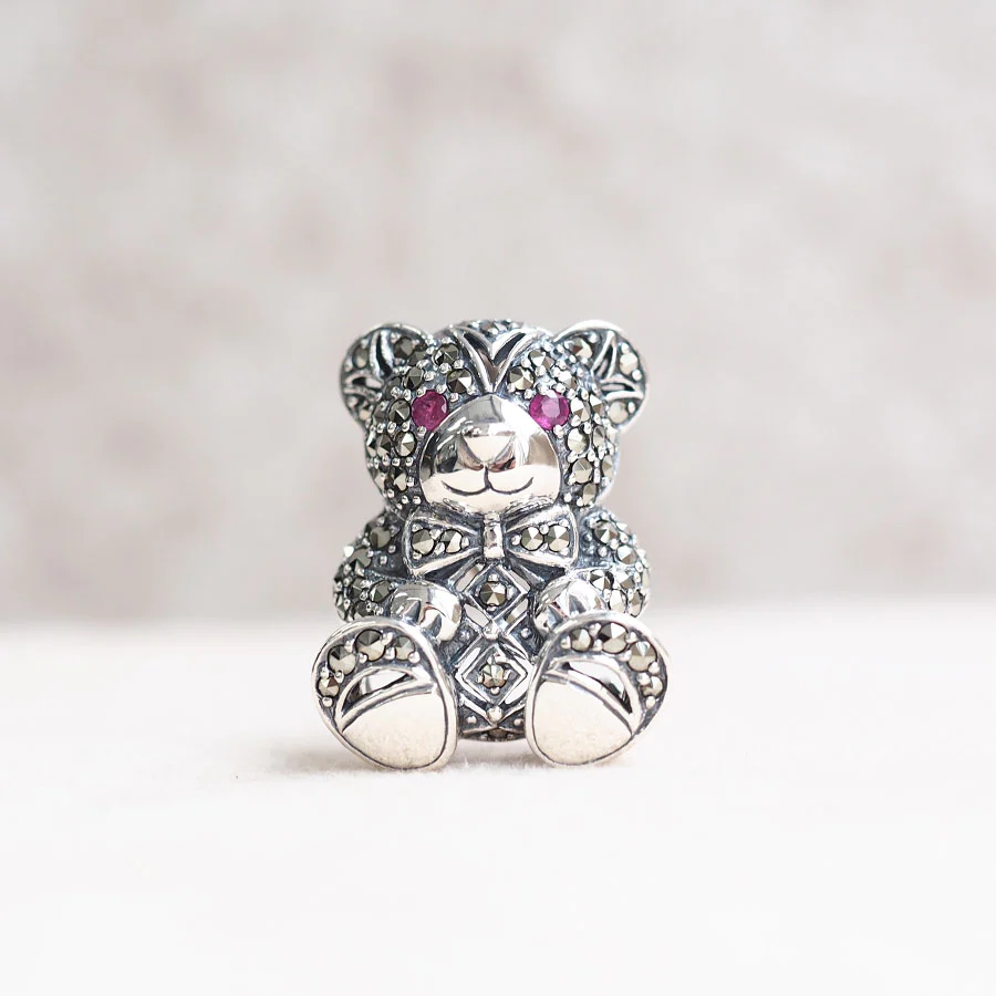 🎀🐻 2025–2026「紅寶眼暴力可愛泰迪」復古馬克賽石小熊兩用胸針/吊墜 (925銀+天然紅寶石Ruby雙眼+滿身滿天星馬克賽石+立體蝴蝶結+真的可以坐著自立!=一物三用:胸針+吊墜+桌面招財小熊) 「一戴即變《唐頓莊園》最兇最甜的伯爵千金,胸口一隻紅眼冒粉紅愛心的小熊,行出街100%被問:妳這隻熊熊幾歲了?怎麼比我還會撒嬌!」 五行屬:超兇火+金+最強招桃花水,主打:爛桃花直接變正緣、單身秒脫單、已婚老公天天送花、犯太歲都能邊賣萌邊發大財