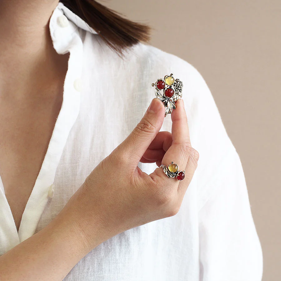 我將塞尚的《蘋果》打造成復古風格的精緻珠寶。紅色和黃色的瑪瑙被擬作光亮的塞尚蘋果。櫻草花上閃爍著馬卡石,而純白的桌布則以銀色細緻地呈現。放在純白桌布上的鮮紅黃蘋果與可愛的櫻草花形成的對比,使這件作品非常吸引人。這是一件以蘋果為主題、非常療癒的作品,無論作為胸針還是項鍊都很推薦。