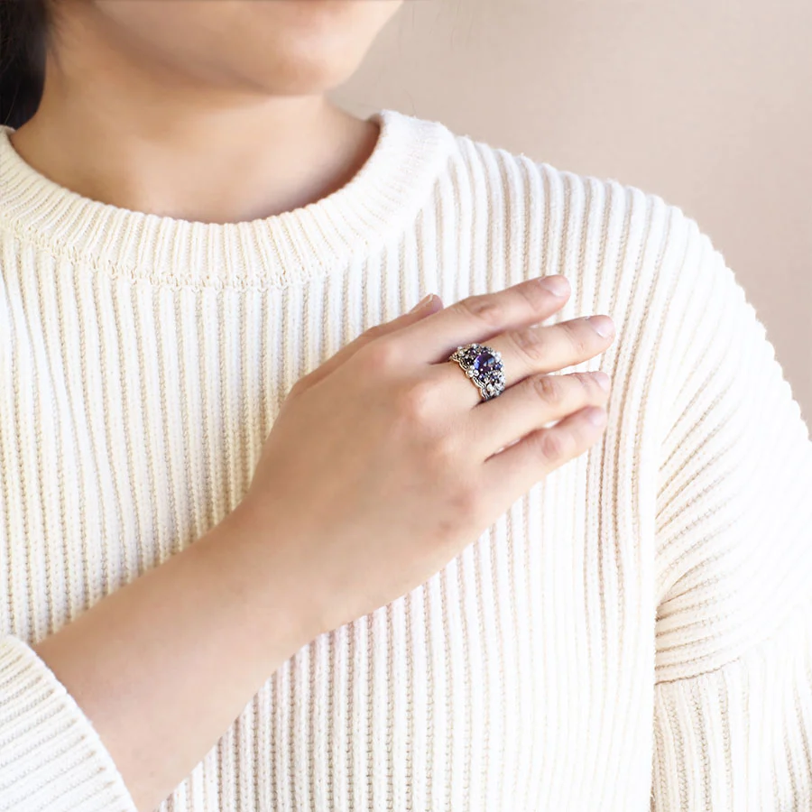 呢枚戒指嘅中心係閃亮嘅蛋面切割紫水晶,周圍環繞住細粒紫水晶同以種子珍珠模仿嘅花朵。小小嘅葉子連續圖案用精緻嘅鏤空製作出嚟,雖然有份量感,但整體感覺輕盈。將植物元素融入設計,據講喺維多利亞時代都好受歡迎。呢枚有存在感嘅優雅戒指,戴上手會即刻令手指變得華麗動人♪