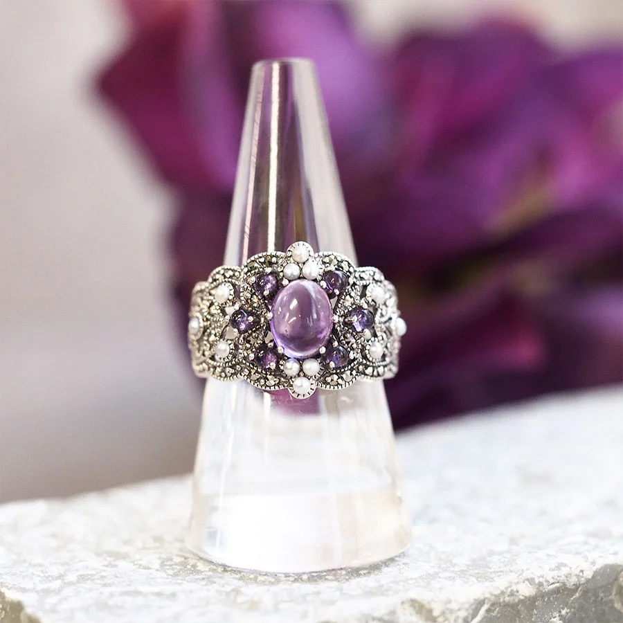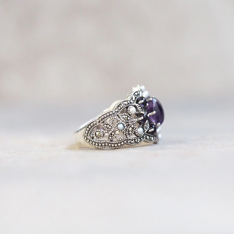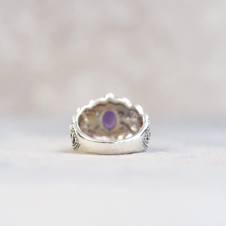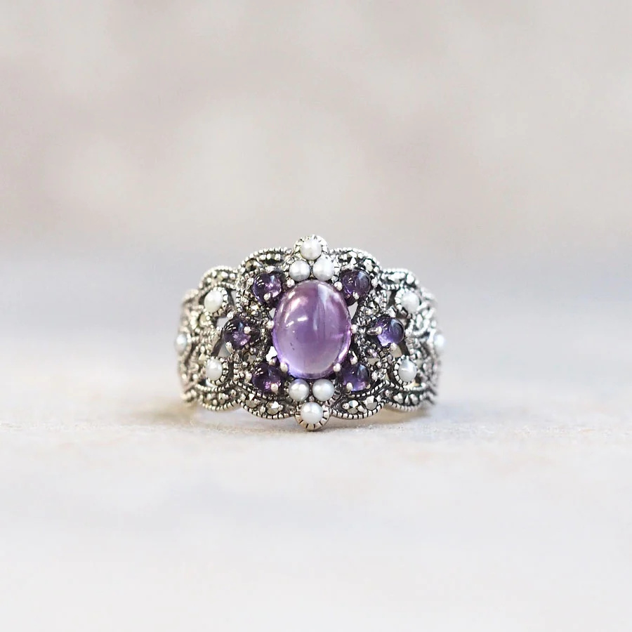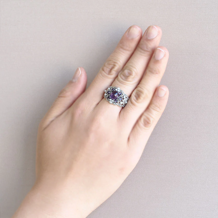 呢枚戒指嘅中心係閃亮嘅蛋面切割紫水晶,周圍環繞住細粒紫水晶同以種子珍珠模仿嘅花朵。小小嘅葉子連續圖案用精緻嘅鏤空製作出嚟,雖然有份量感,但整體感覺輕盈。將植物元素融入設計,據講喺維多利亞時代都好受歡迎。呢枚有存在感嘅優雅戒指,戴上手會即刻令手指變得華麗動人♪