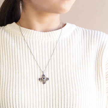 以透明感十足嘅閃爍吸引人嘅紫水晶作為花心設計嘅吊墜。小花周圍再以紫水晶花瓣環繞,呈現優雅嘅設計。用金屬製作嘅花瓣飽滿圓潤,感覺柔和。中央向上下左右伸展嘅花瓣,寶石排列同尺寸均勻,喺以花為主題而多數偏可愛風格嘅碌山作品中,帶出少少冷冽又現代嘅氣息。亦推薦畀想享受稍微不同氛圍嘅朋友♪