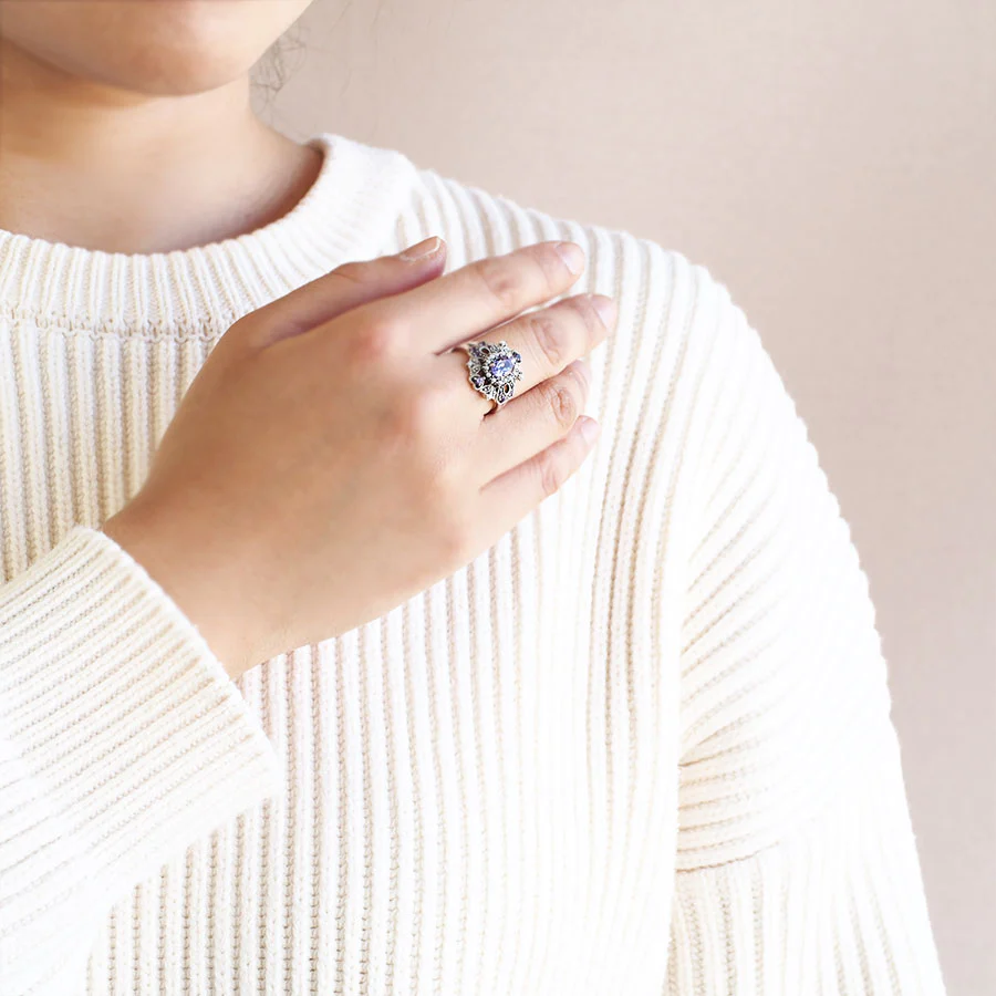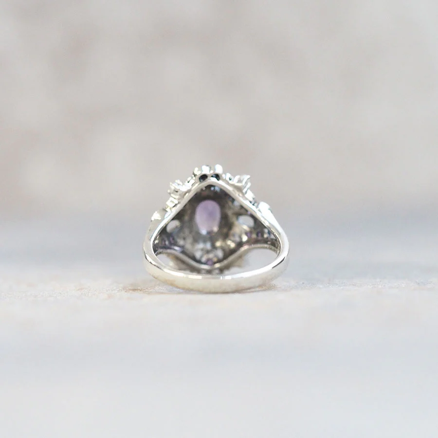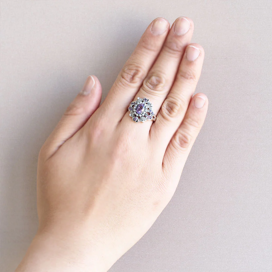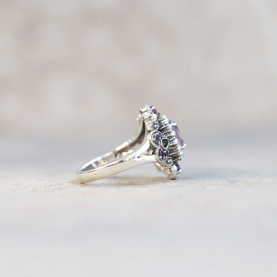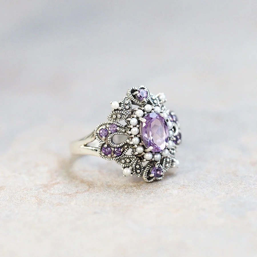 橢圓形切割嘅紫水晶周圍圍住種珍珠嘅設計,仲有細細粒嘅種珍珠小花點綴,充滿咗浪漫又可愛嘅細心心思,完全打動女性嘅心♪