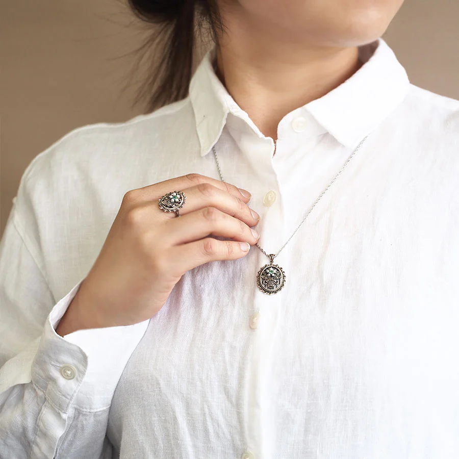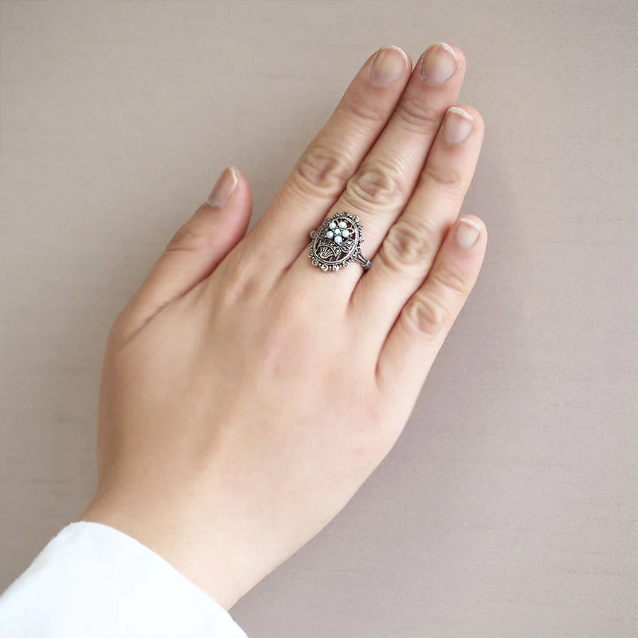 呢款戒指係以清澈美麗嘅綠色祖母綠同小珍珠花製成嘅可愛花束圖案戒指。地金製成嘅葉子同花束等細節都描繪得非常細緻,加上磨邊工藝,令戒指更有立體感。圍住花束嘅邊框帶有蕾絲,營造浪漫氣氛♪