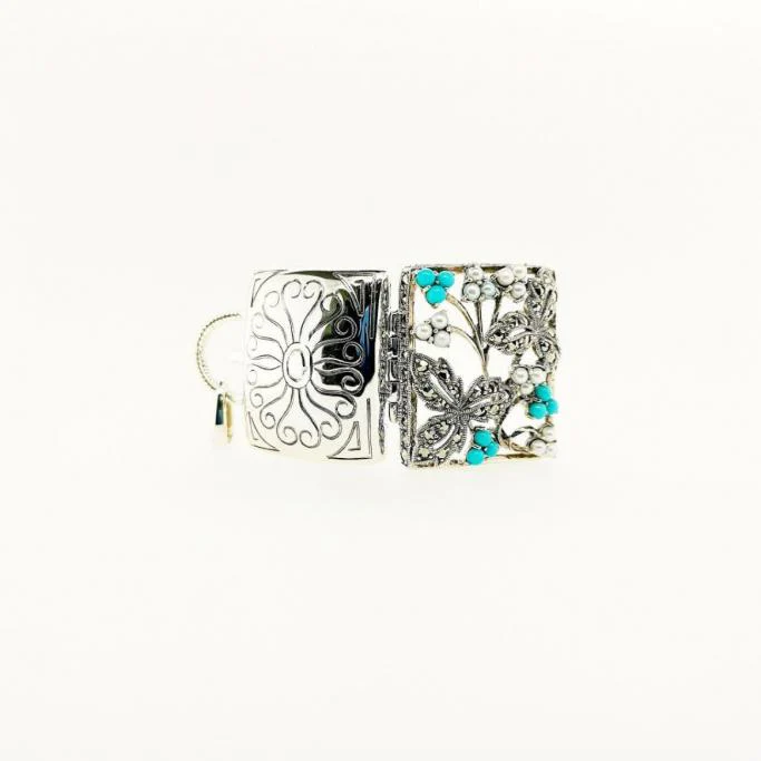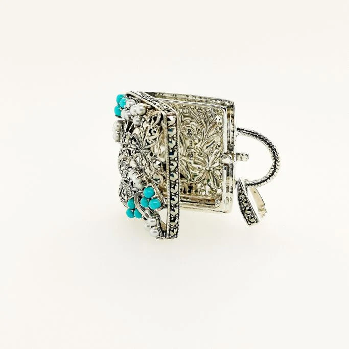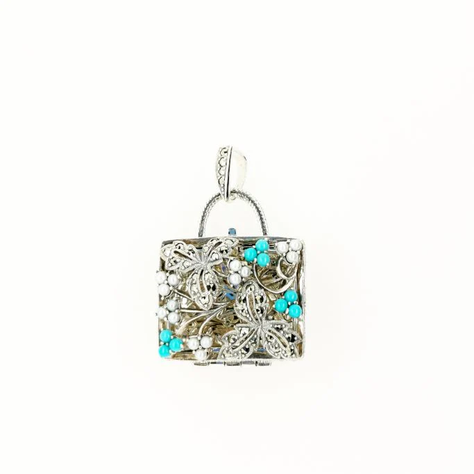 以手袋圖案為靈感的開合式懷錶吊墜。 漂亮的葉子形狀,以及土耳其石和珍珠小花緊密排列成輕巧的手袋圖案,是非常浪漫的吊墜。 由於厚度足夠,可以放入藥物或乾花瓣等物品。 商品管理番号 207P0061-TQ サイズ 約30×25mm 素材 SV925 Turquoise、Marcasite、Pearl 注意事項 ※請注意,由於使用天然石材,因此可能存在個體差異、天然裂縫和內含物,並且實際天然石材的顏色可能會因瀏覽器而異。 ※不含鏈條 請按讚:喜歡 正在載入...