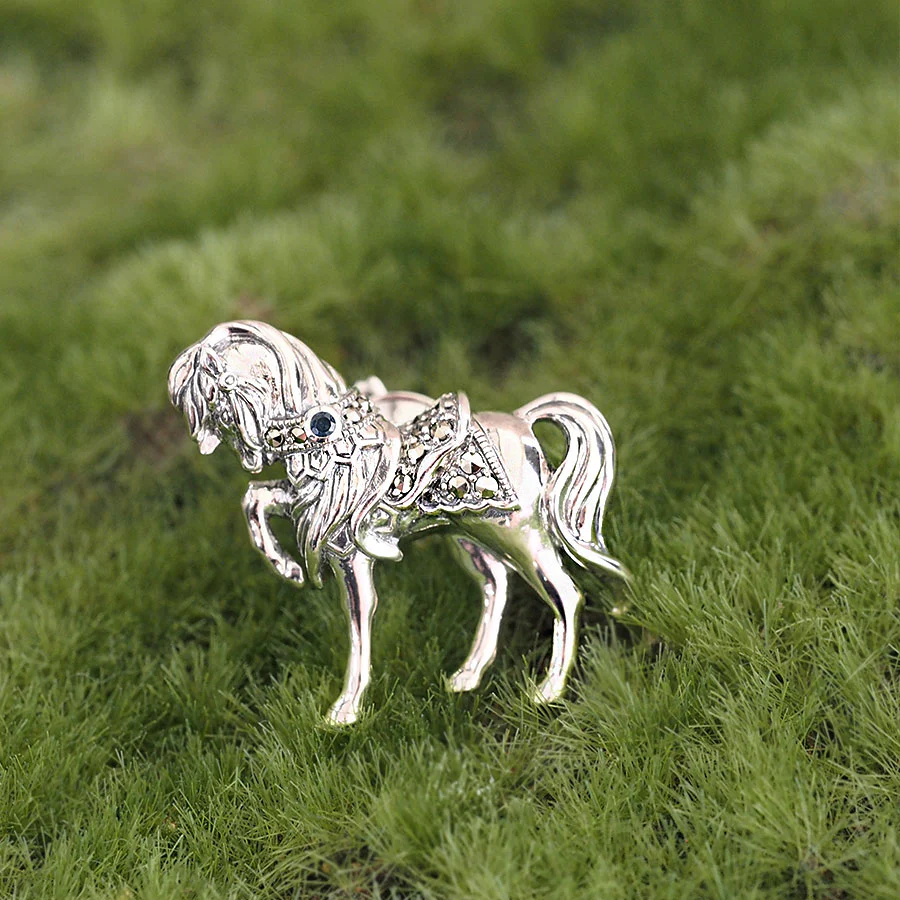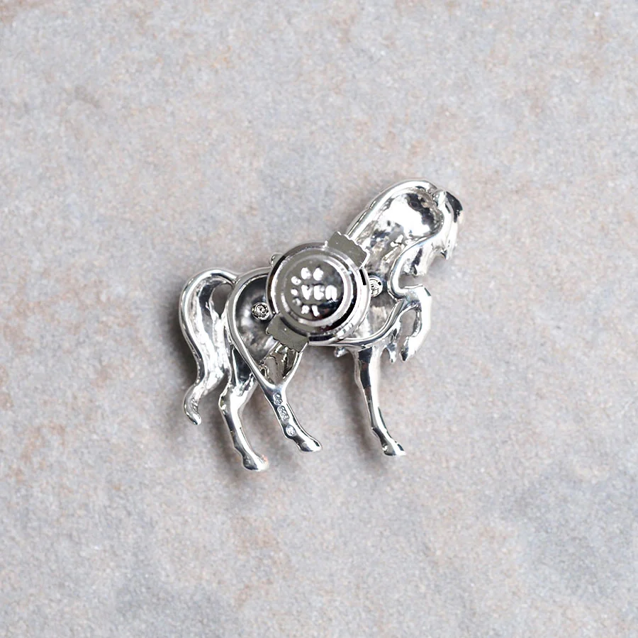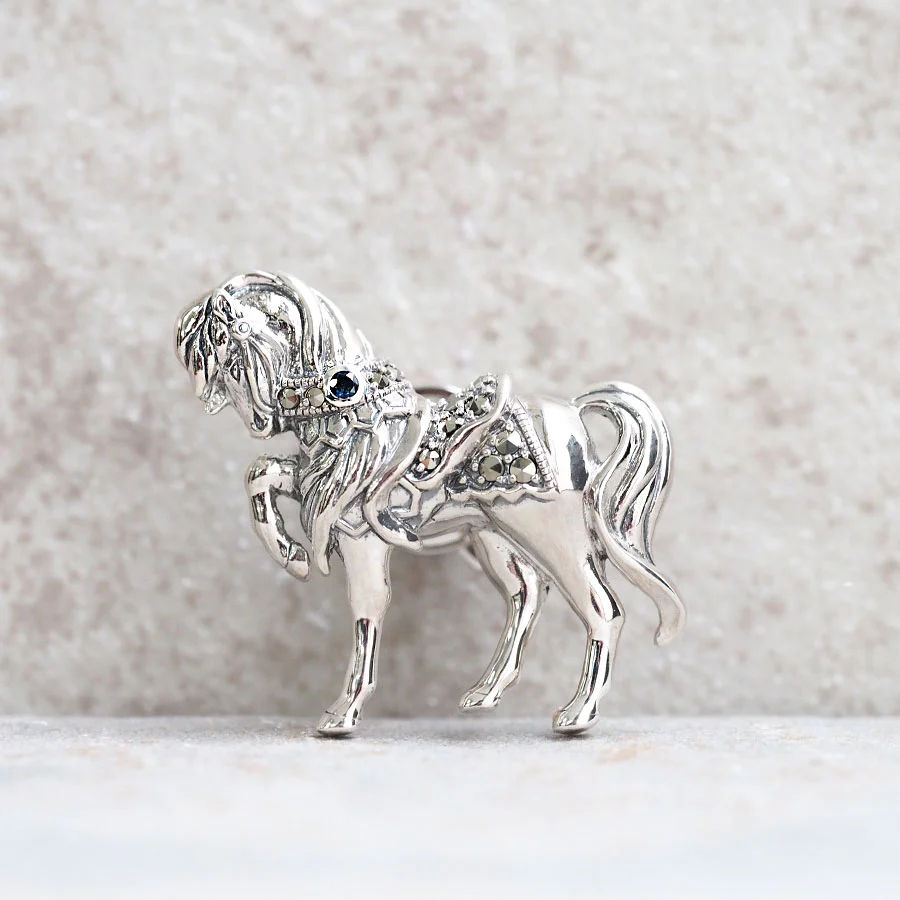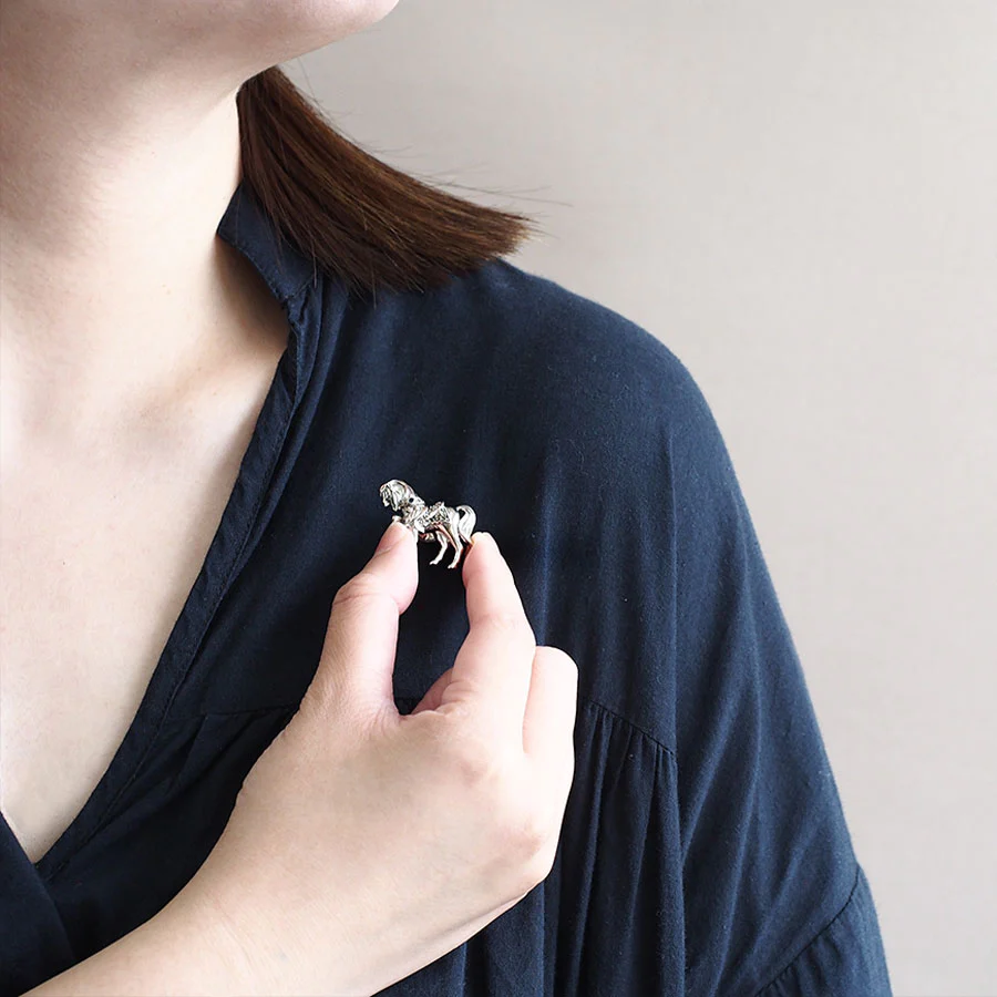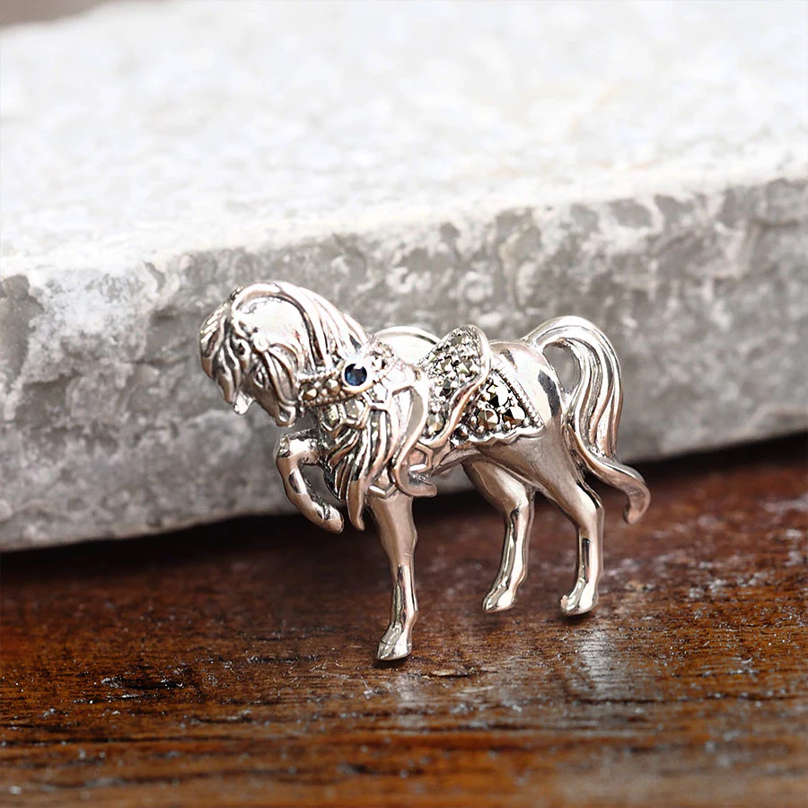 呢款別針胸針以騎馬盛行嘅國家英國嘅皇室小馬作為設計靈感。  設計靈感來自於白金漢宮美麗庭園中小馬打扮得漂漂亮亮,與女王陛下嬉戲嘅景象。  立體感嘅馬匹造型非常美,而作為點綴嘅深藍色璀璨切割藍寶石亦令人目光難以移開。  飄逸嘅鬃毛、纖細嘅腿、純血馬嘅體型,工匠精心打造到每一個細節,甚至能感受到手工溫度,令人不自覺沉浸其中。  唔單止適合自己佩戴,亦非常適合作為送畀男性嘅禮物♪