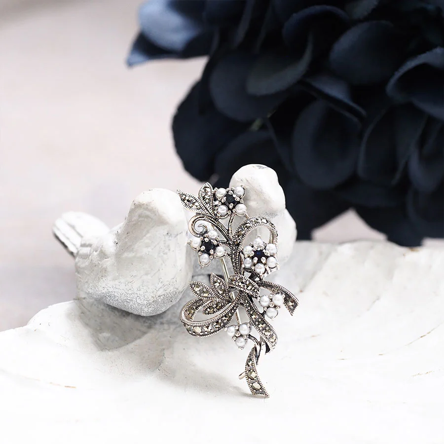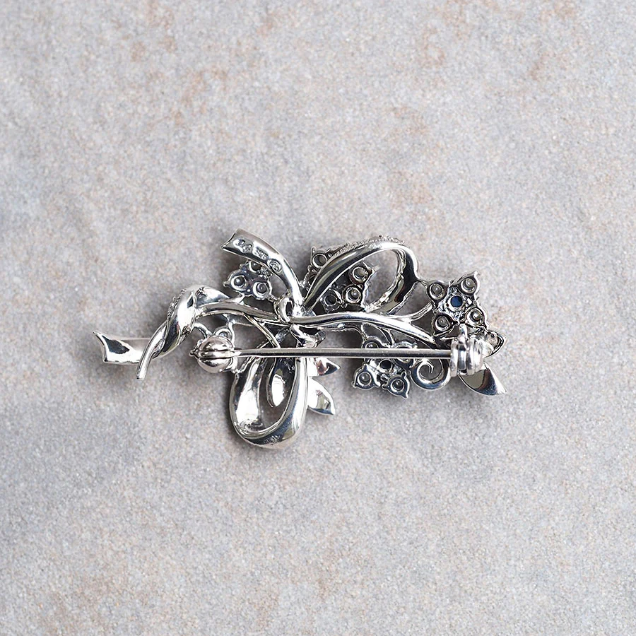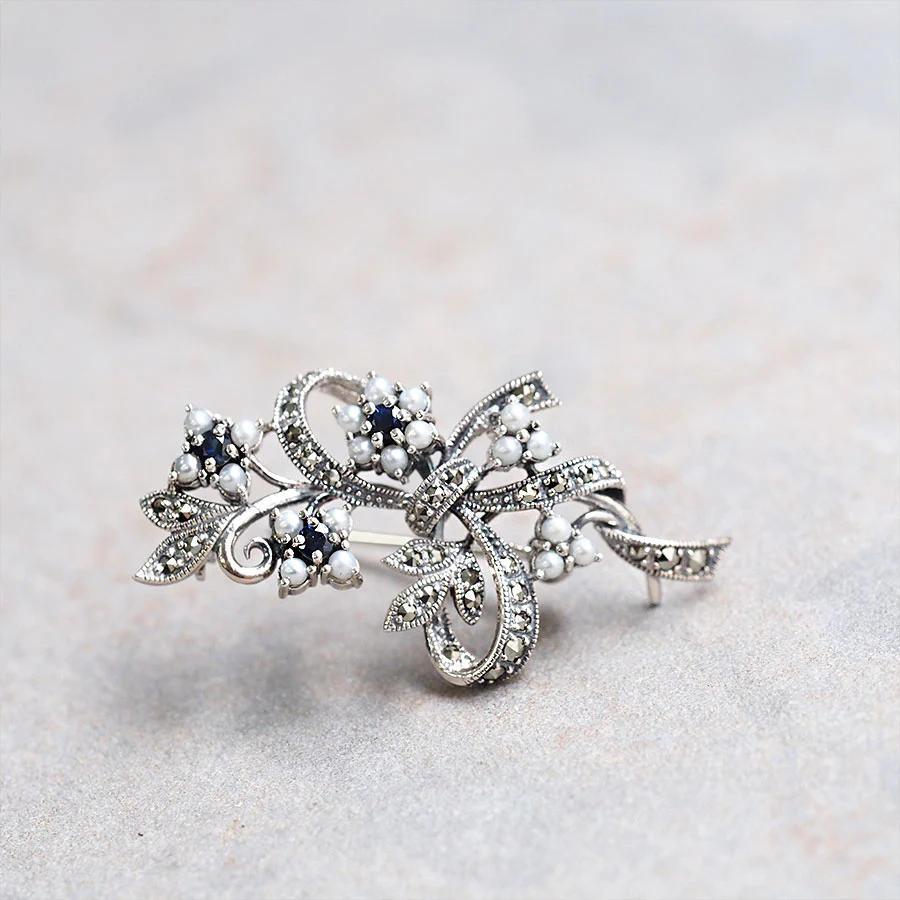 呢枚胸針係以藍寶石同珍珠仔做成嘅可愛細花,用柔軟嘅絲帶輕輕束成花束嘅造型。