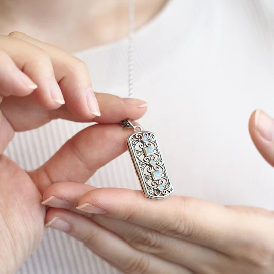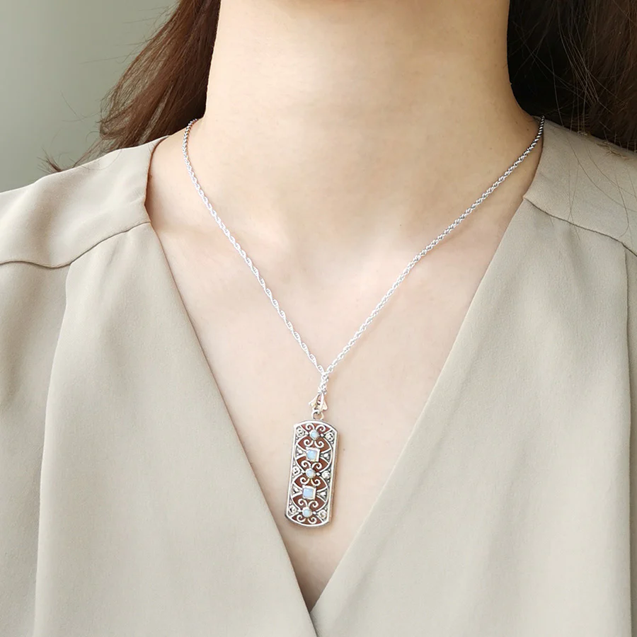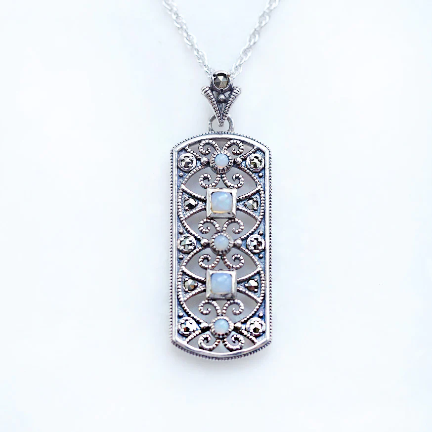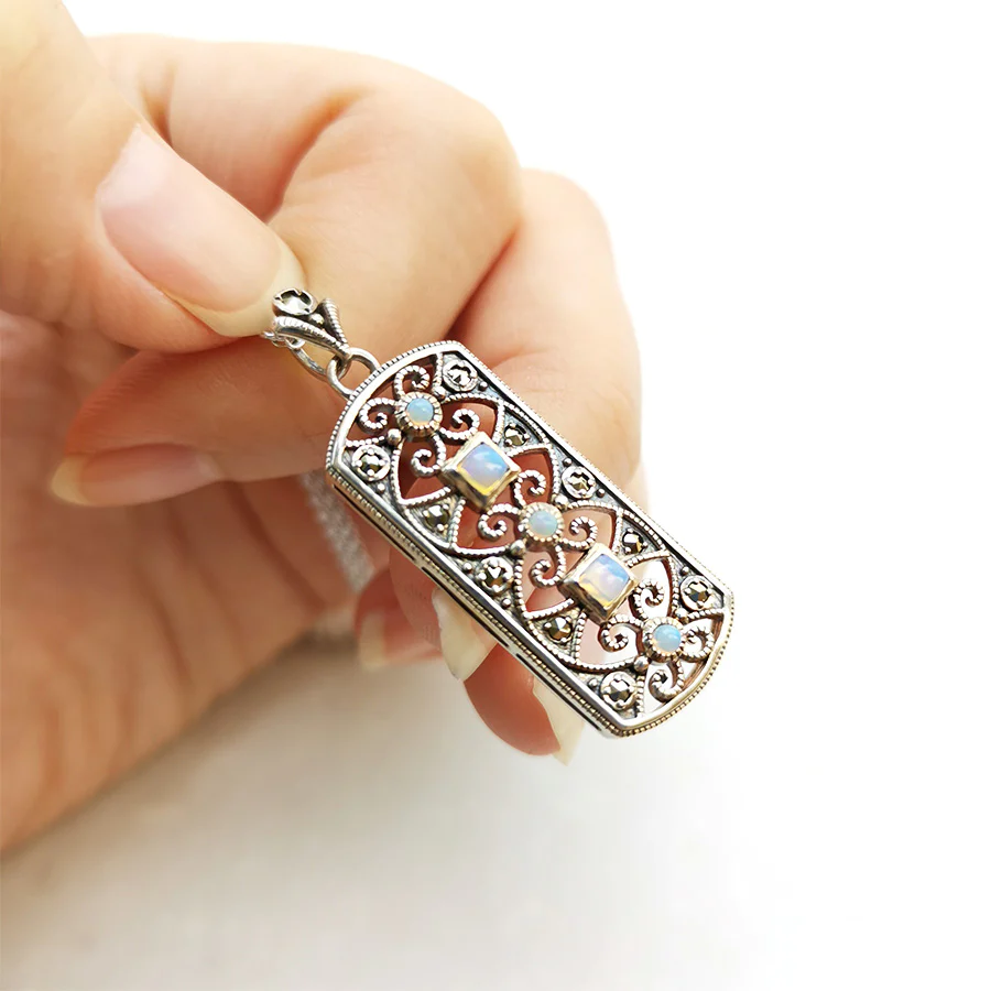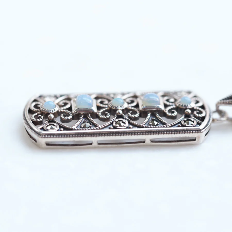 呢款現代設計將虹色閃耀嘅玩色效應美麗蛋白石嘅圓形切割同方形切割配合阿拉伯拼花風格嘅設計。幾何圖案同唐草圖案嘅精緻線條如同蕾絲工藝般經過計算層次製作,與簡潔利落嘅外輪廓形成對比,係一款好靚嘅吊墜。 商品管理番号 403P0102 サイズ 約41×15mm 素材 SV925 Opal、Marcasite 注意事項 ※請注意,由於使用天然石材,因此可能存在個體差異、天然裂縫和內含物,並且實際天然石材的顏色可能會因瀏覽器而異。 ※不含鏈條 請按讚:喜歡 正在載入...
