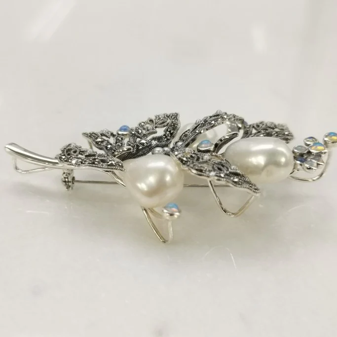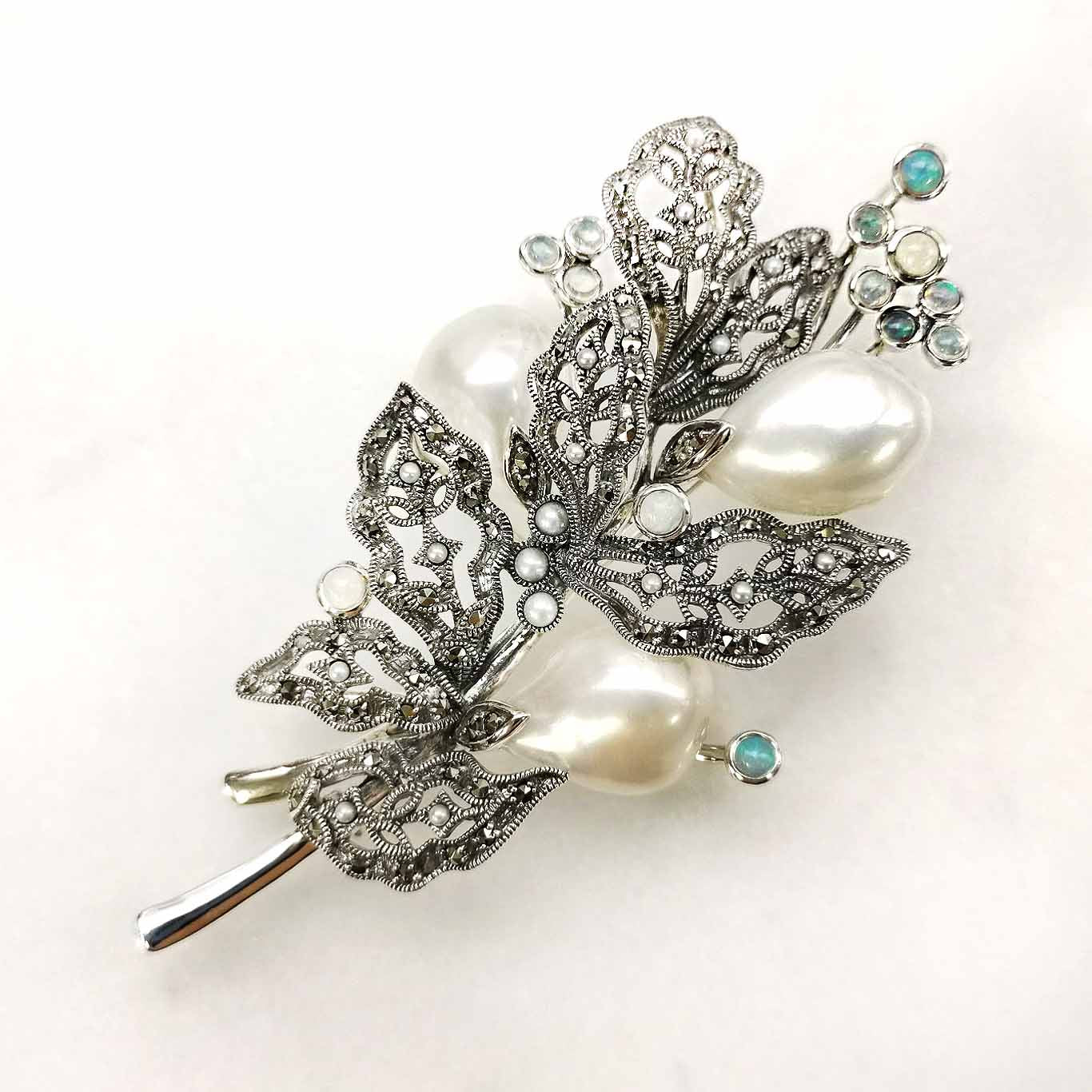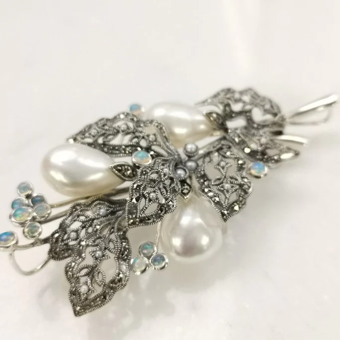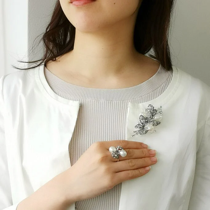 用大量奢華的大型巴洛克珍珠製作的葉子與果實胸針。 性格獨特的巴洛克珍珠生動地表現出獨一無二的果實神態。 葉子部分做了如葉脈般的鏤空設計,因此不會感覺沉重,整體輕盈。 這款設計方便佩戴,非常適合在典禮場合,為裝扮增添華麗感。 商品管理番号 403C0195 サイズ 約81×40mm 素材 SV925 Opal、Marcasite、Pearl 注意事項 ※請注意,由於使用天然石材,因此可能存在個體差異、天然裂縫和內含物,並且實際天然石材的顏色可能會因瀏覽器而異。 ※不含鏈條 請按讚:喜歡 正在載入...